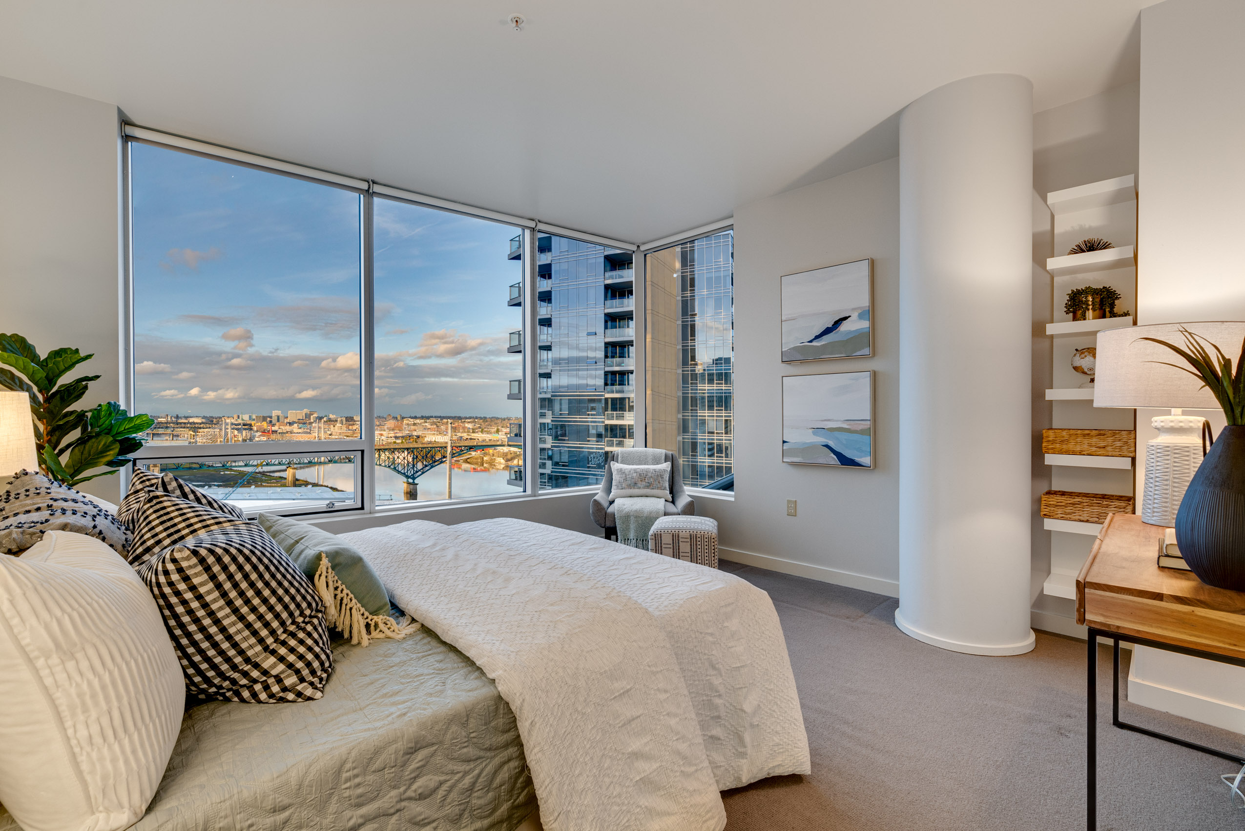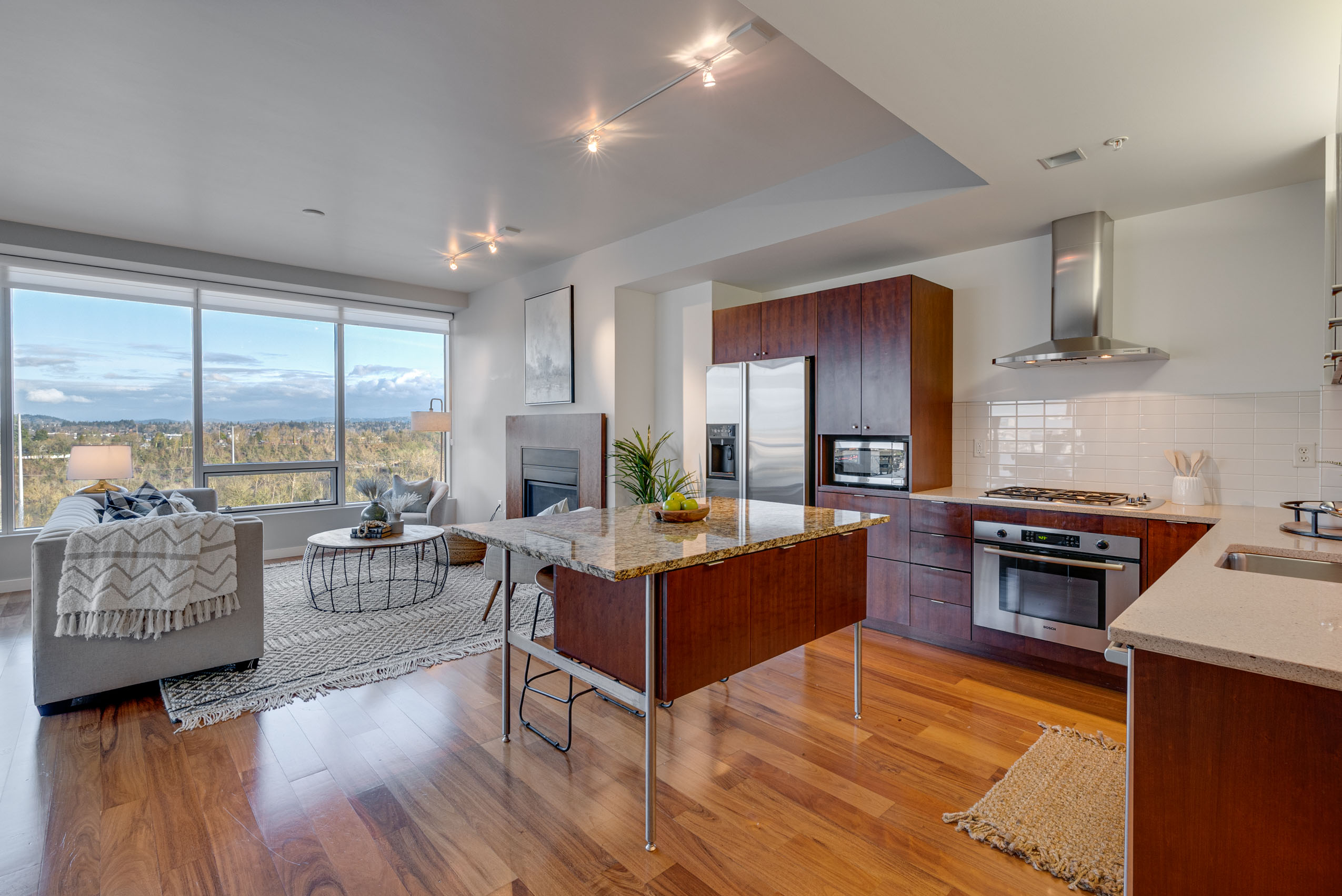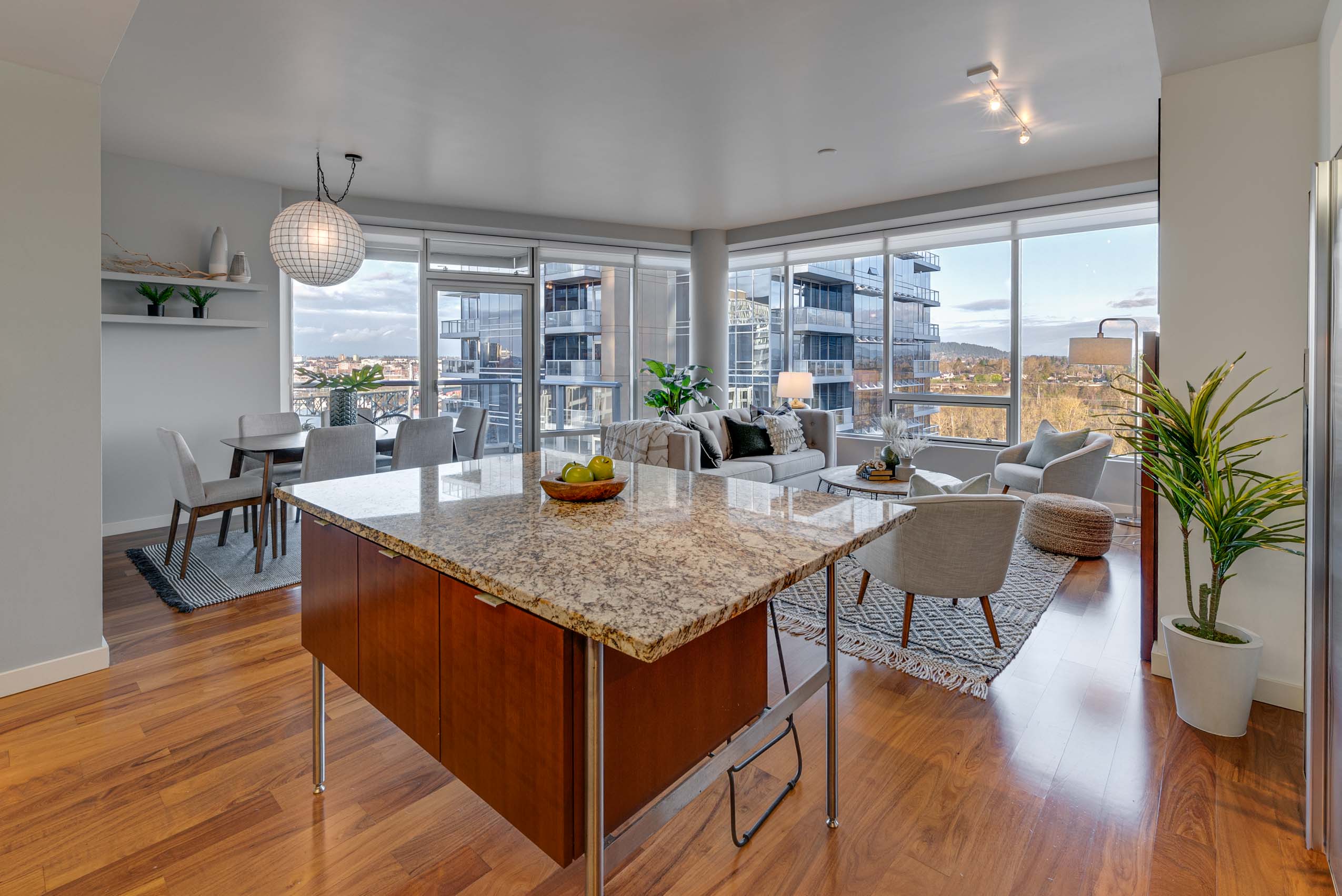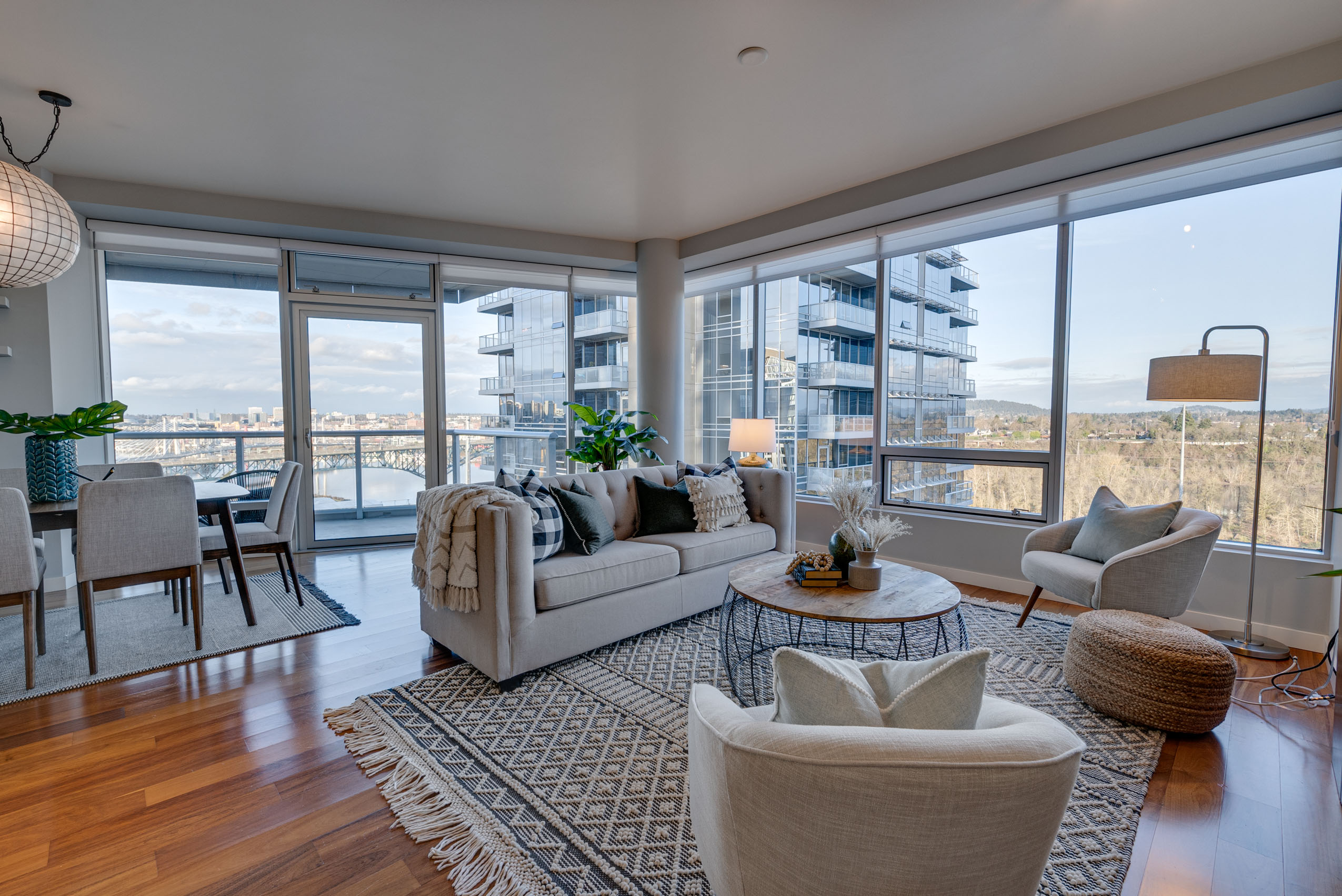 Mountain, river and city views for days from this 16th floor corner condo in the Meriwether. Inspiring sunrise light shows over Mt. Hood, view of Mt St Helens, front row river view, city lights and multiple firework shows! Park your car and enjoy city living with nature access! Launch your kayak from the commons in front of the building, take the street car to downtown, ride the tram up to OHSU, bike or walk the river trail. Dog park, food, groceries, coffee and shopping at arms reach.