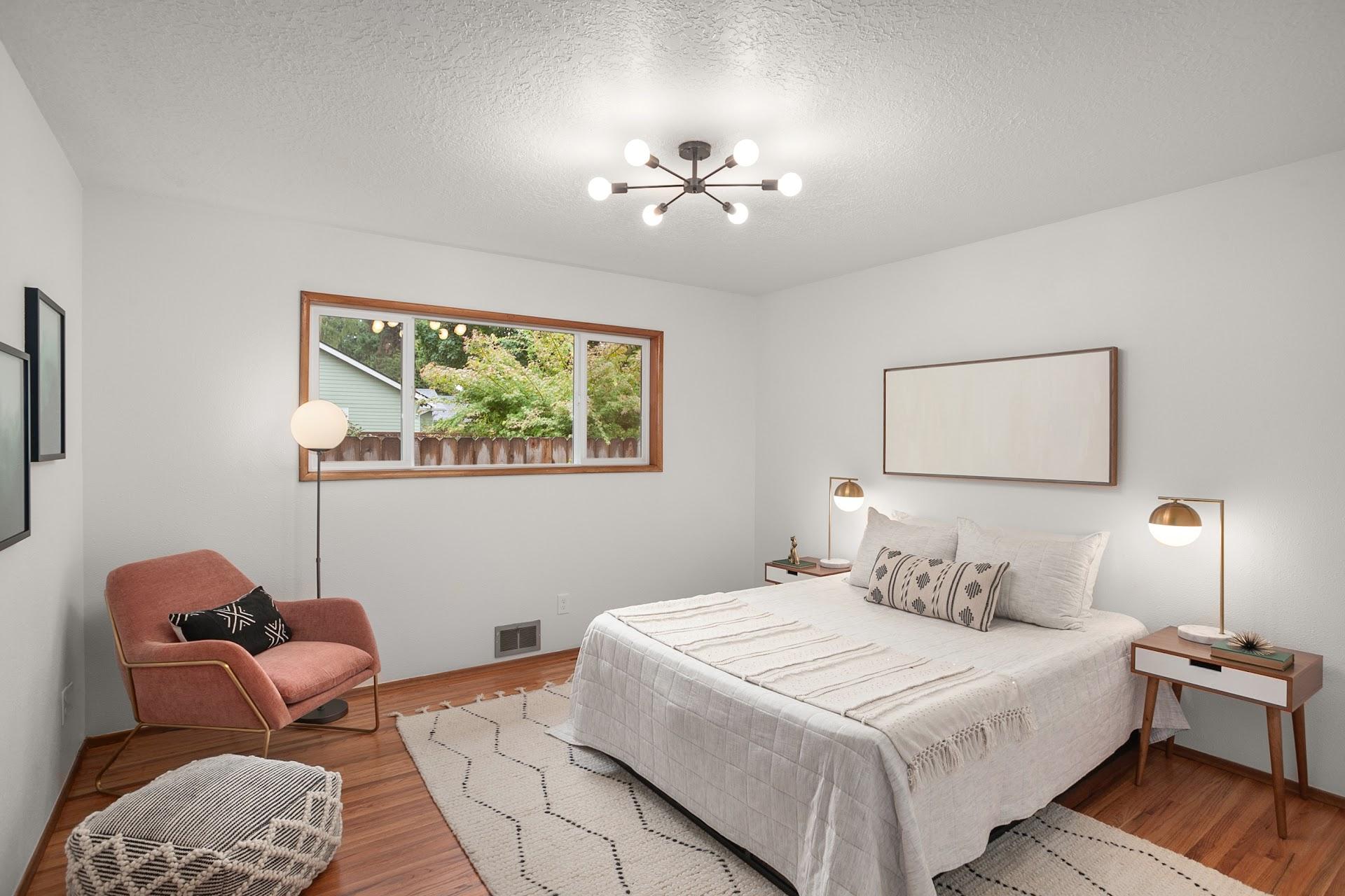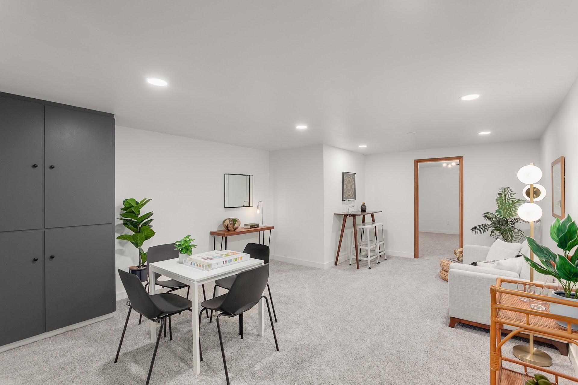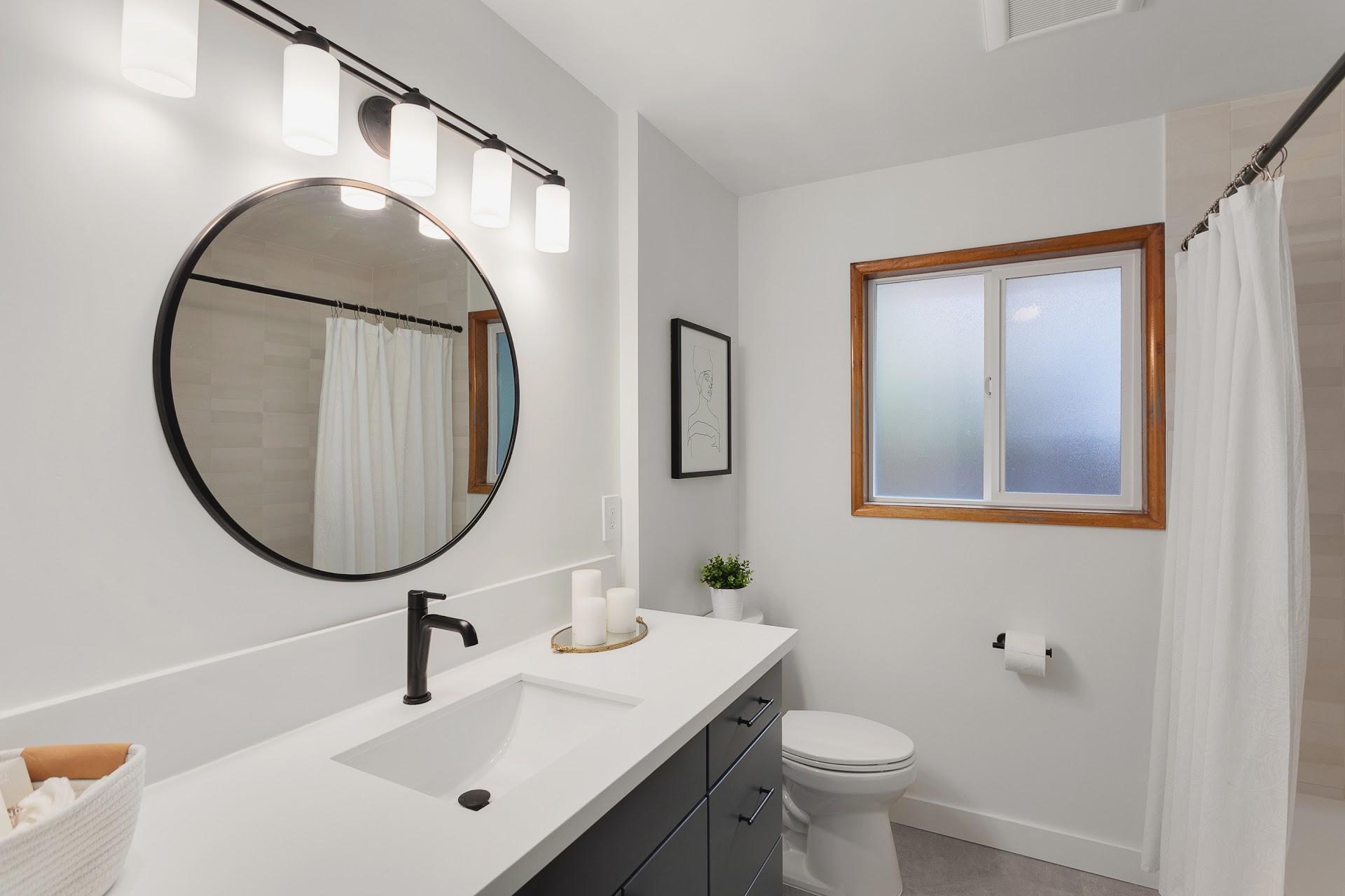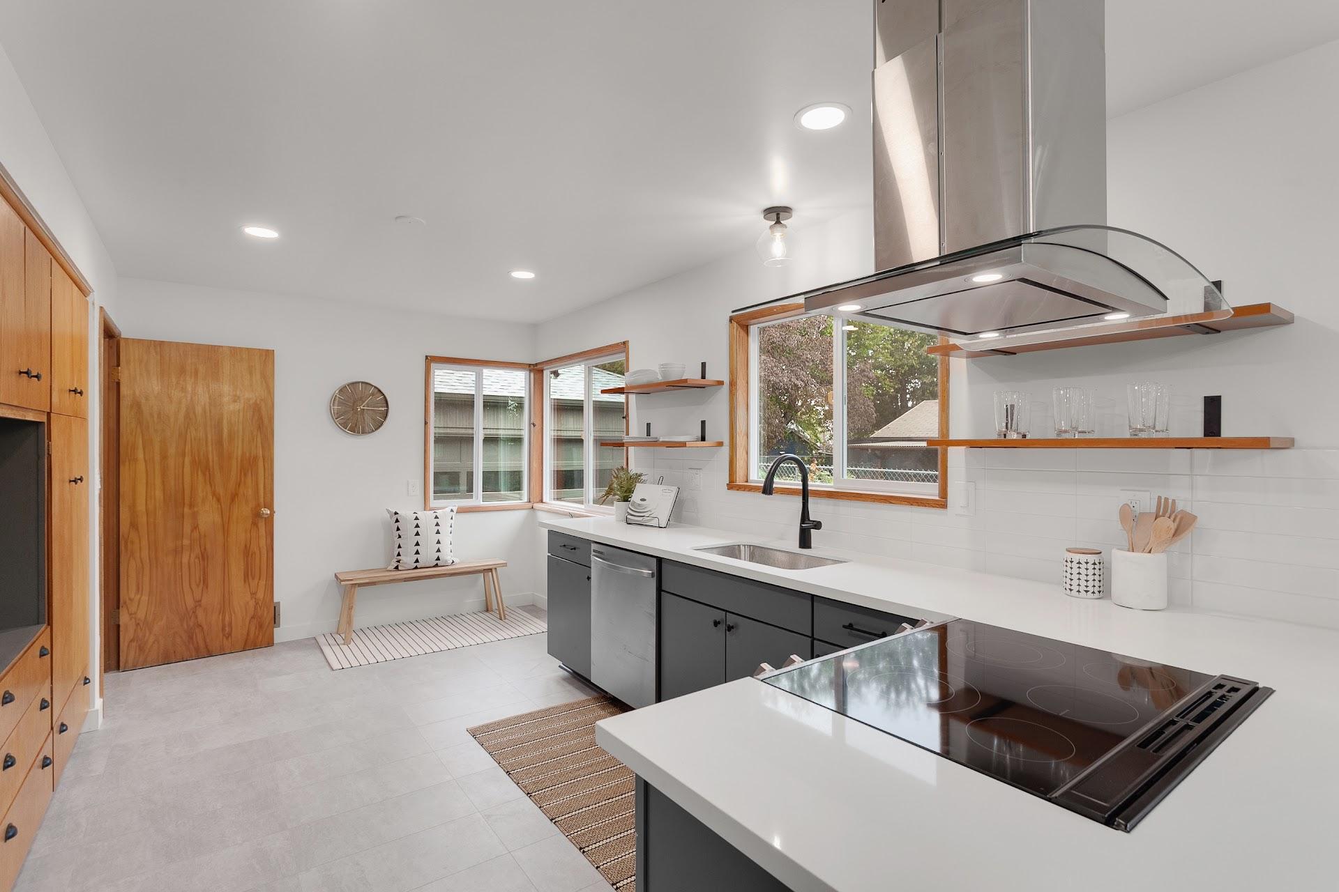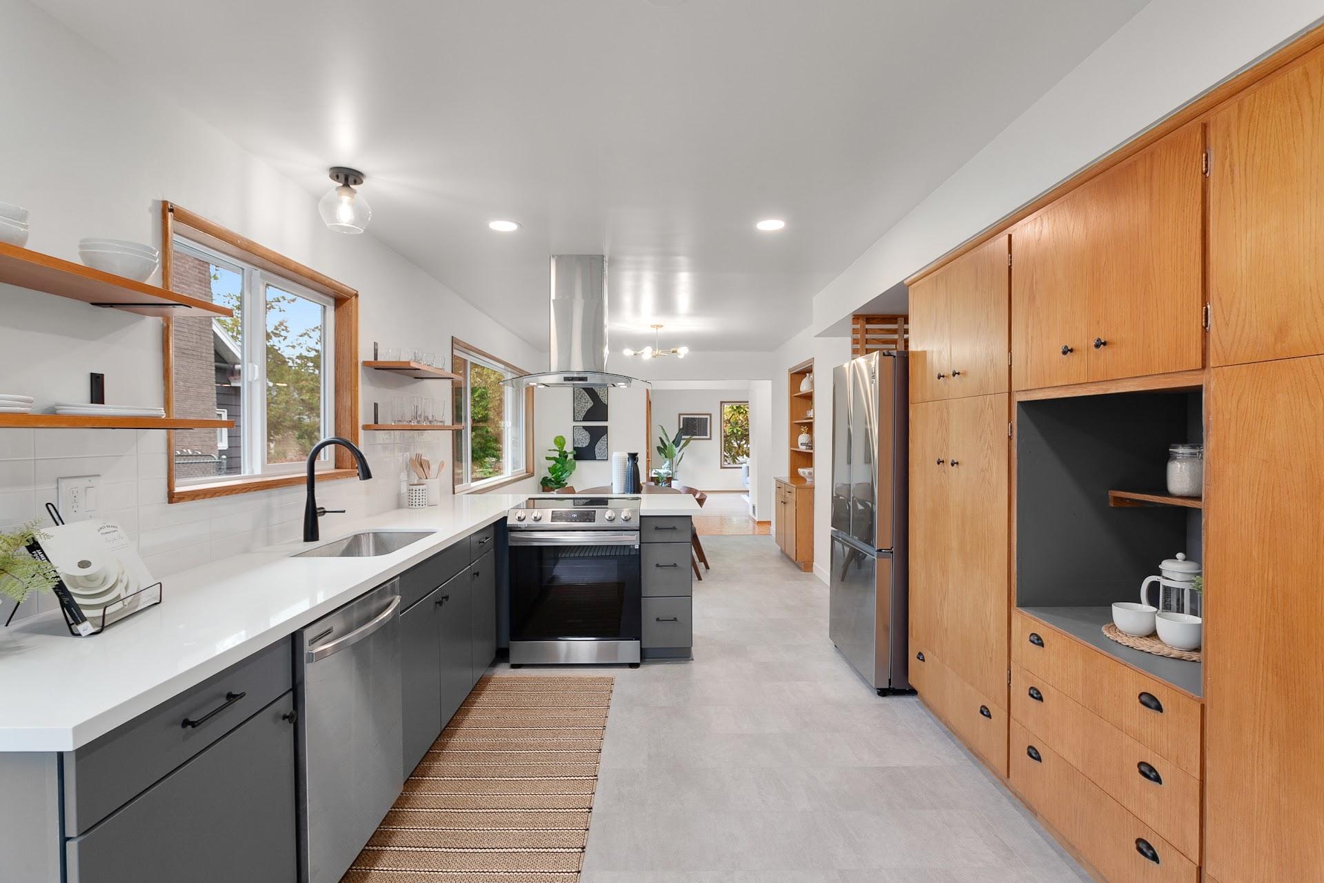 Sophisticated mid-century with a classic design. New renovations complement the many restored, original features. New kitchen cabinets and peninsula with quartz counters perfectly nestled in with original built-ins. Large new windows and open spaces create bright main floor living with new flooring and original wood burning fireplace. Lower level with separate entrance and high ceilings has two functional family rooms, fireplace, 2 bedrooms and full bath. New roof and 96% efficient furnace. Walkscore: 84, Bike scores 99.