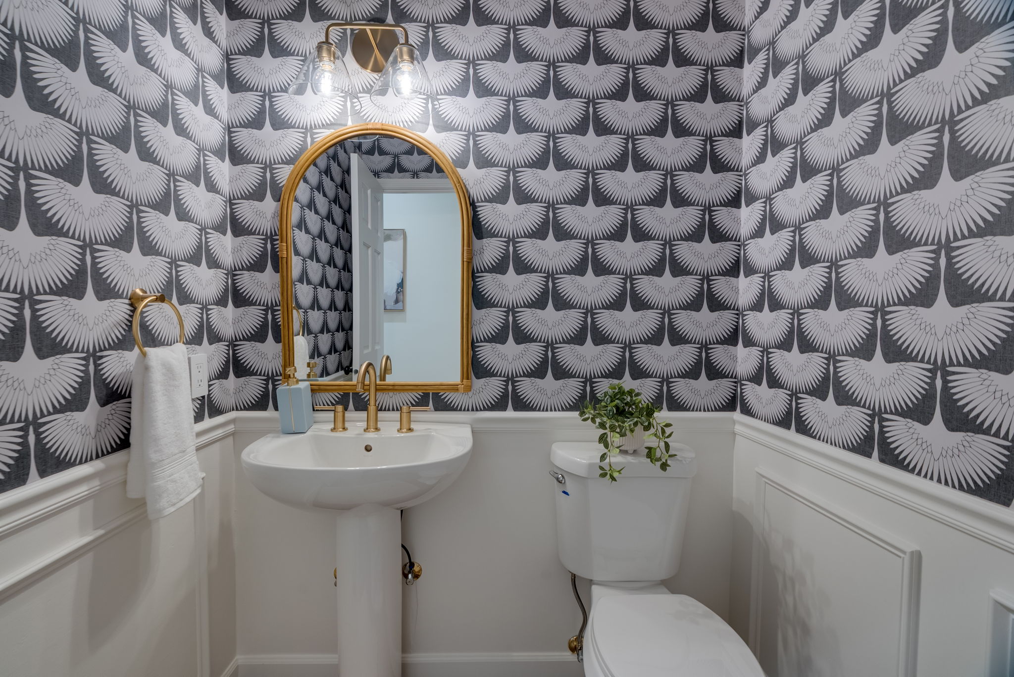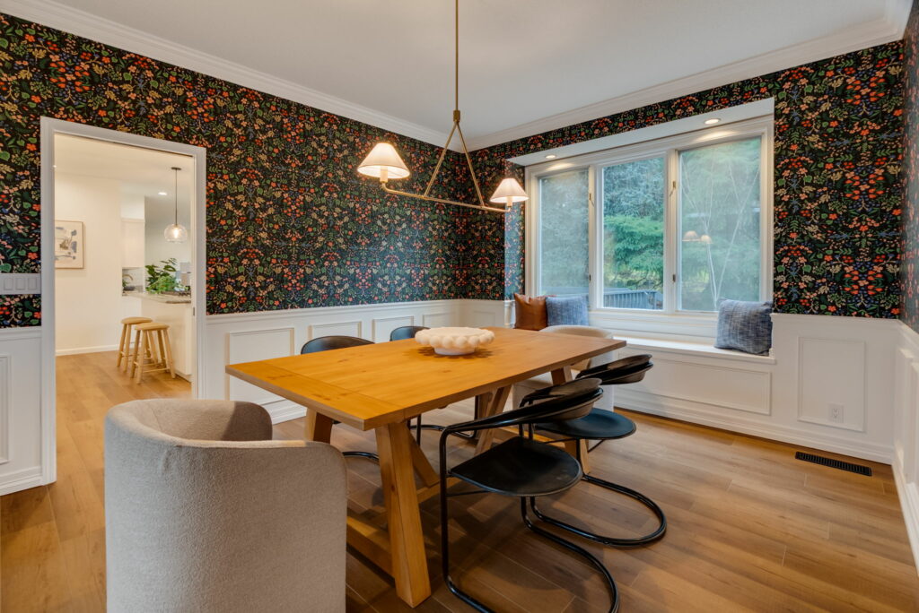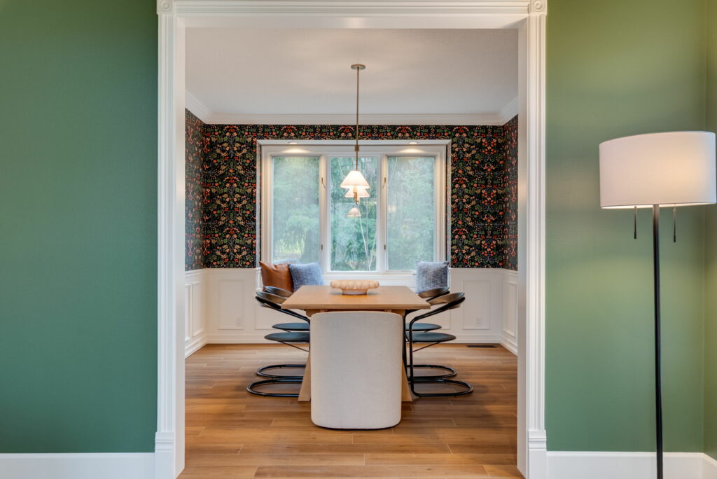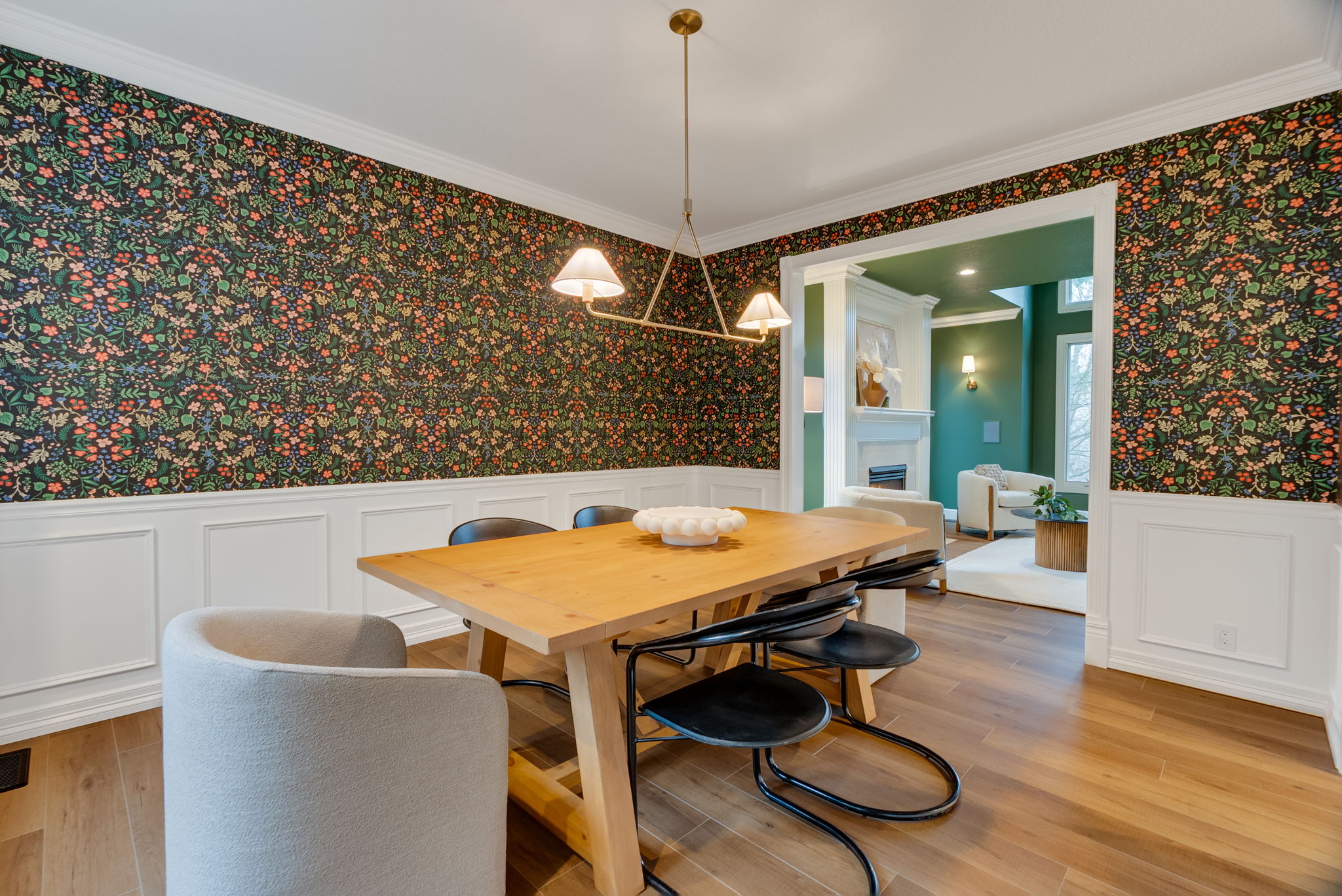 Added Personality: we decided a few bold paint colors weren’t enough, so we added whimsical wallpaper to the dining room & powder bath. For the dining room we chose Wildwood from Rifle Paper Co – all of their prints are gorgeous but this one went well with the green in the living room. For the Powder Bath we chose Feather Flock from Tempaper – kudos to the installers for lining up the bird beaks 😉