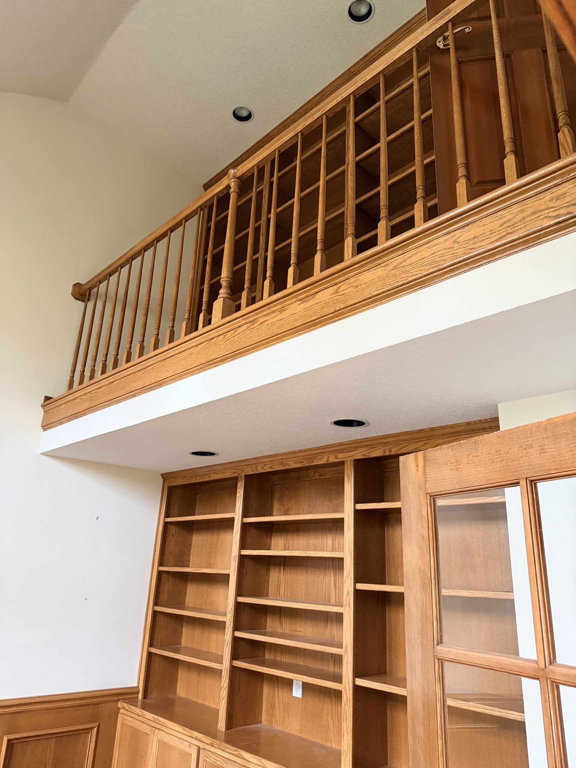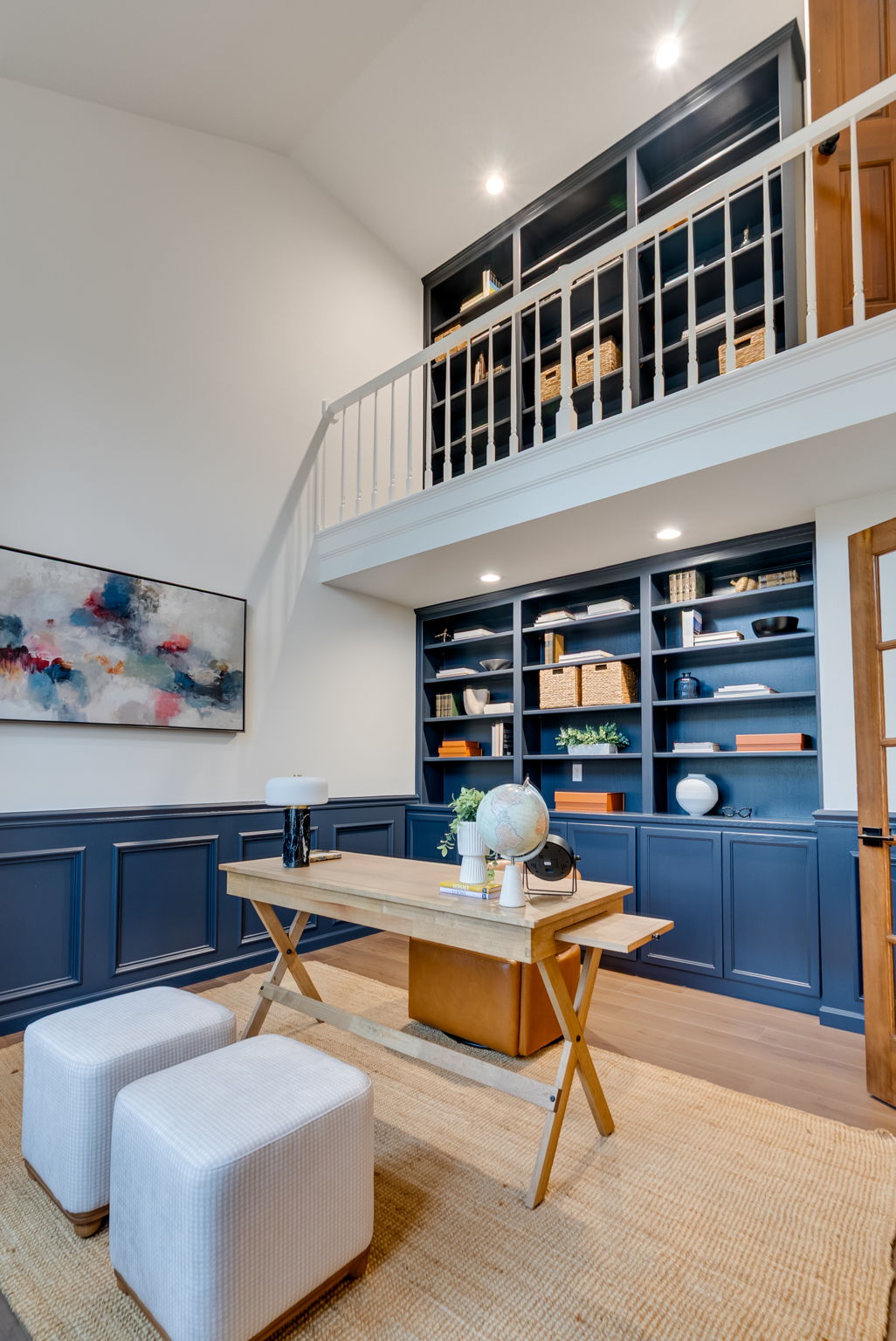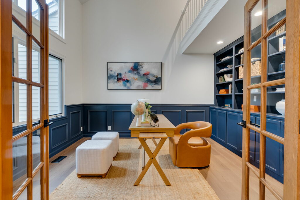 We knew we wanted to feature the home’s unique two story office – but it was full of dated woodwork. Instead of painting the walls, we went for it & painted the woodwork Hale Navy, also from Benjamin Moore. We left the wood stained french doors unpainted, to give it some contrast with the white.