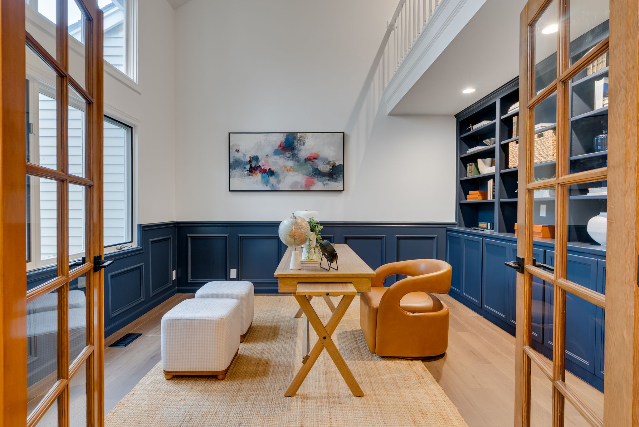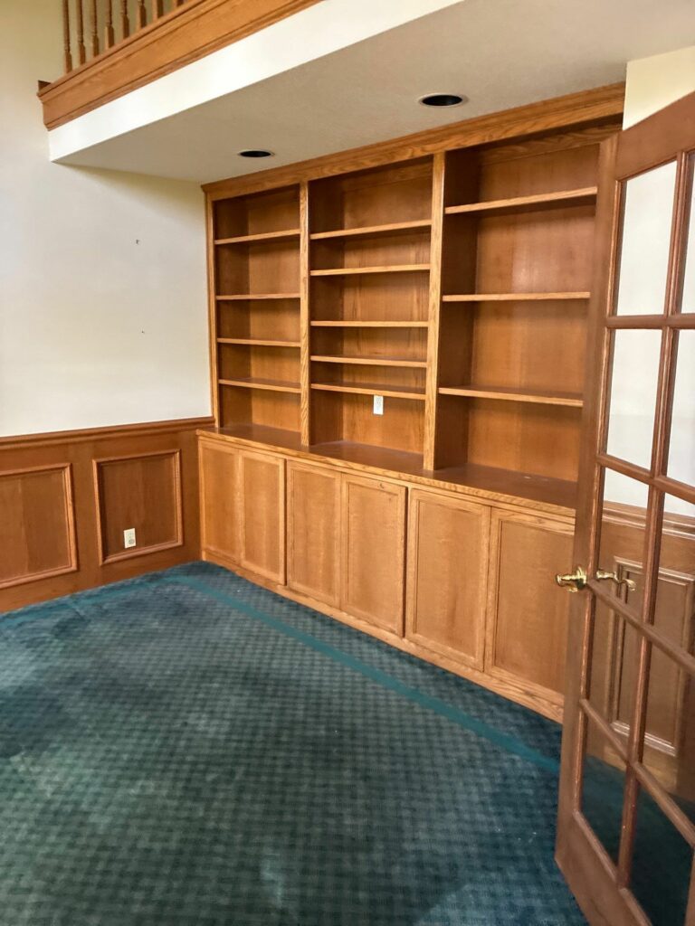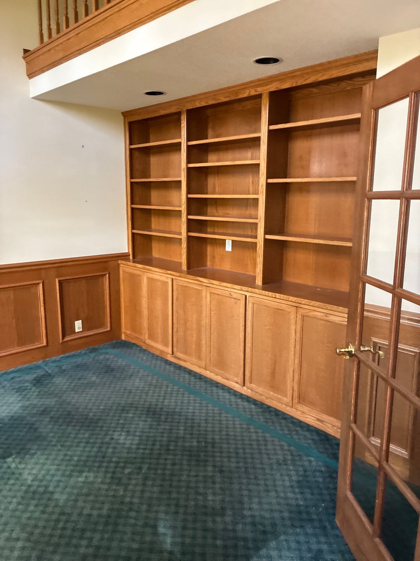 We knew we wanted to feature the home’s unique two story office – but it was full of dated woodwork. Instead of painting the walls, we went for it & painted the woodwork Hale Navy, also from Benjamin Moore. We left the wood stained french doors unpainted, to give it some contrast with the white.