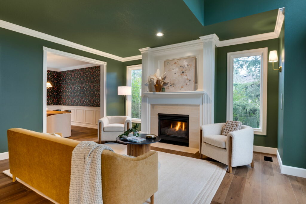 But how many listings have you seen lately that are covered in white walls and some art from Target? (guilty!!). We wanted to have a little fun with color & bring our listing photos to life in order to set this home apart from the rest. After some trial & error, we chose Benjamin Moore Avon Green for the living room. Adding the color to the ceilings gave it that moody vibe we were going for.