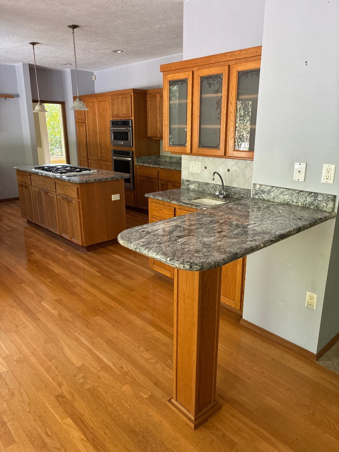We gave this kitchen a little nip & tuck 😉 It wasn’t in the budget to renovate the entire kitchen just to sell the house. So we put the money where we knew it would pay off… cosmetics. Here’s the before… before we installed new floors, removed the peninsula, painted the cabinets, replaced the tile backsplash, updated the lighting & hardware and installed new appliances.