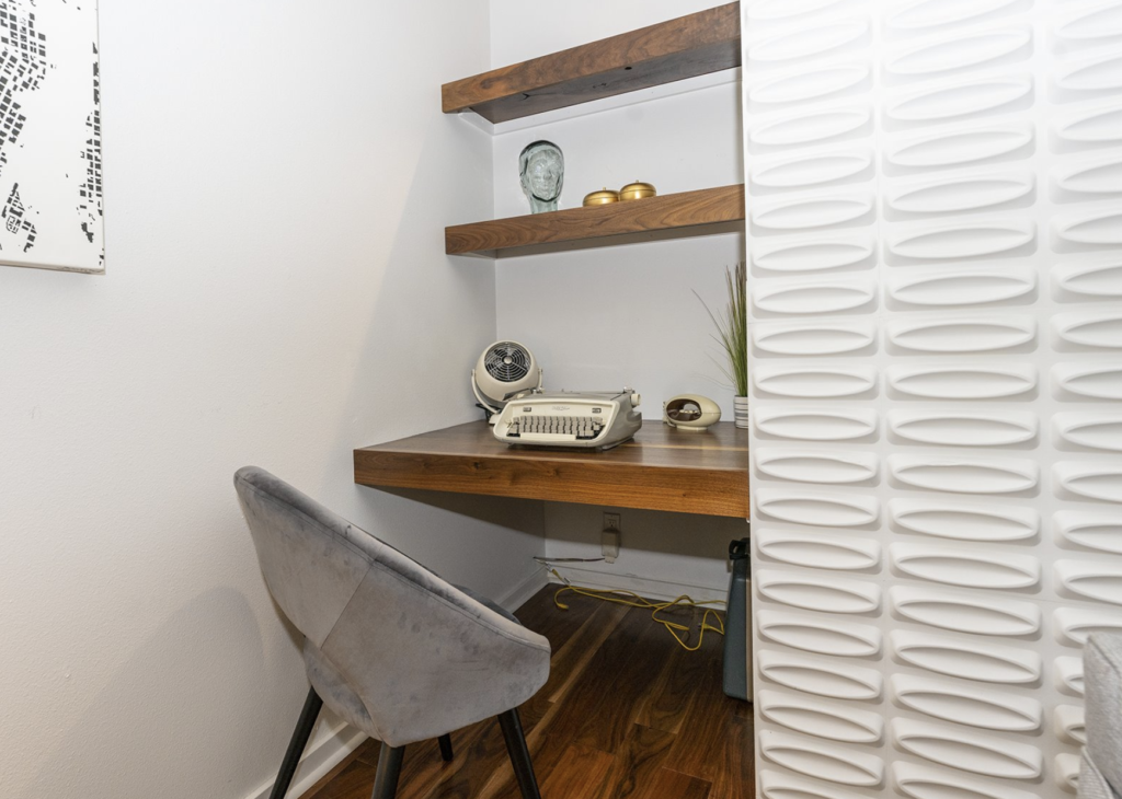 There are some gorgeous midcentury signature features that help make this place special. The decorative mid-century molded wall made with sugarcane. A custom desk made with local black walnut.