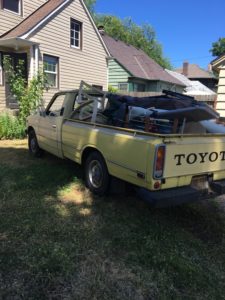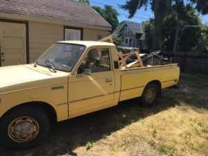 When I was 26, I was living on top of the Star E Rose on Alberta and wanted a truck because I wouldn’t leave the house if it was raining and it was always raining. I found this little yellow pickup for $800 on Craigslist in St. Johns. When I got there and drove it, it only ran in 1st and 3rd gear but I was so in love and optimistic I offered the guy $700 and drove it back home.