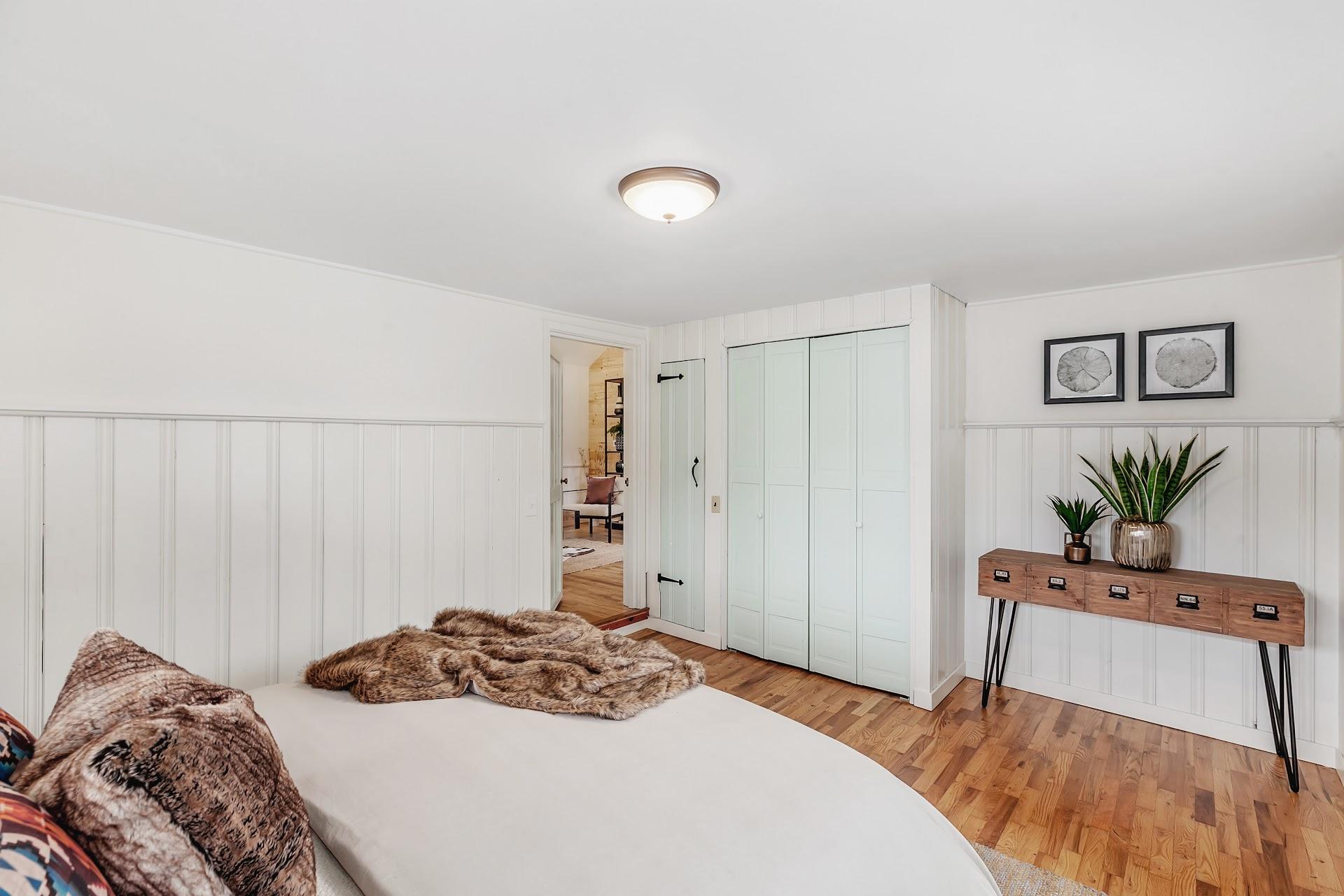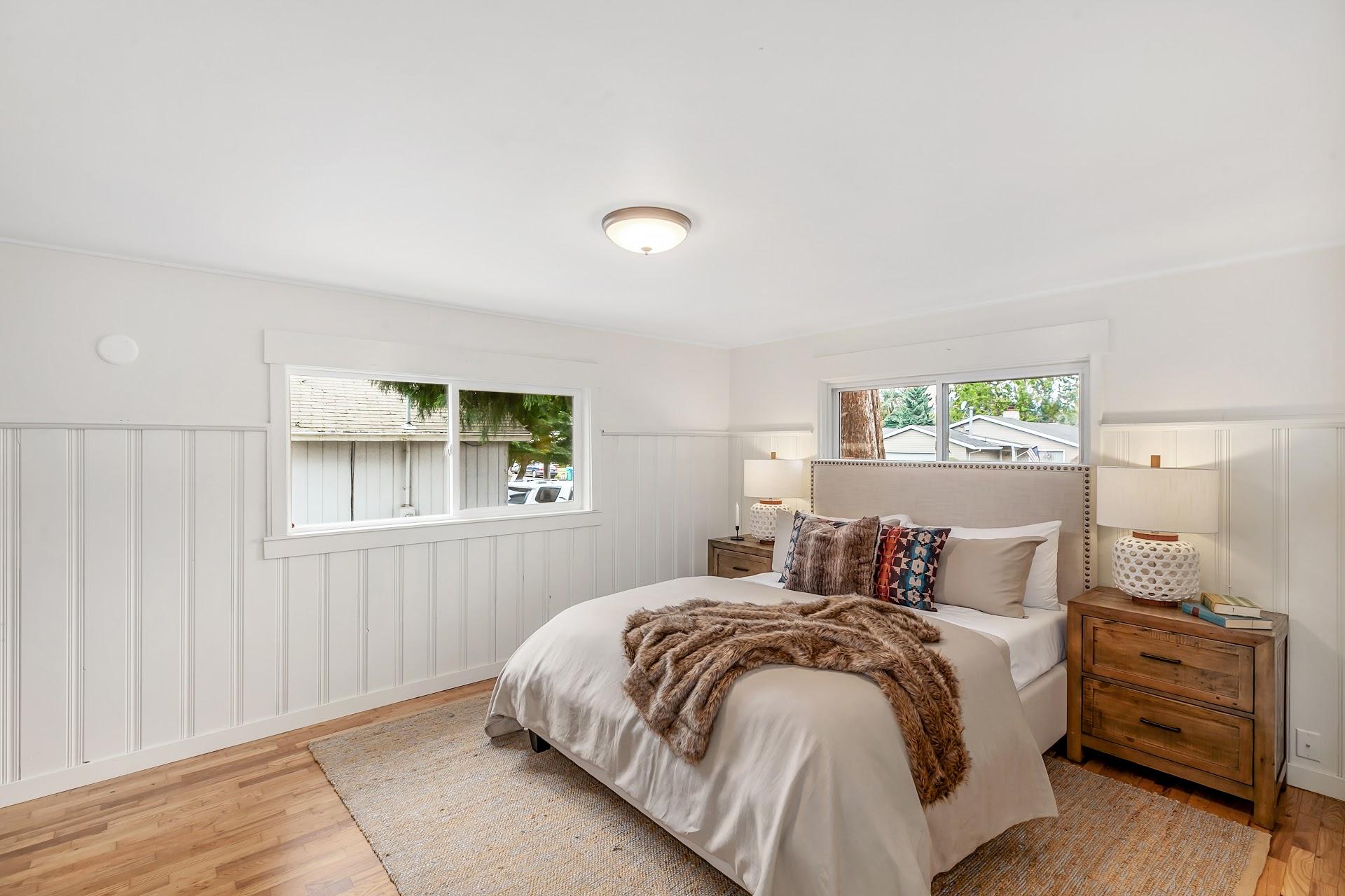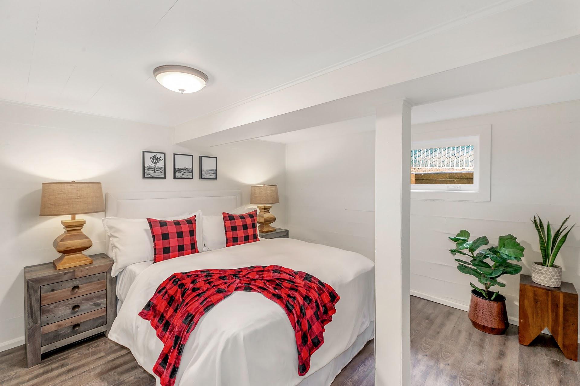 Step down into the large and cozy bedroom with pine wainscoting. Look out to the Evergreen in the front yard with a 7 foot wide tree trunk. Yep, you will feel like you’re in a luxury treehouse.