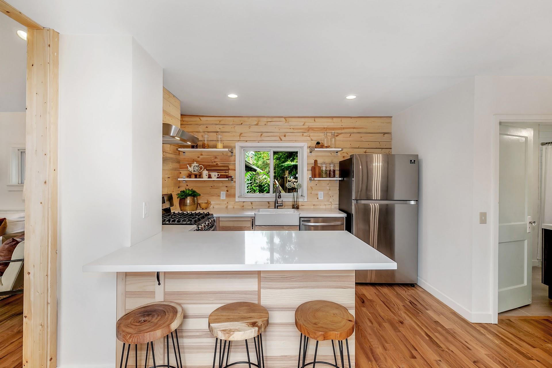 Continuing through the living room to the new custom kitchen with breakfast bar and quartz counters.