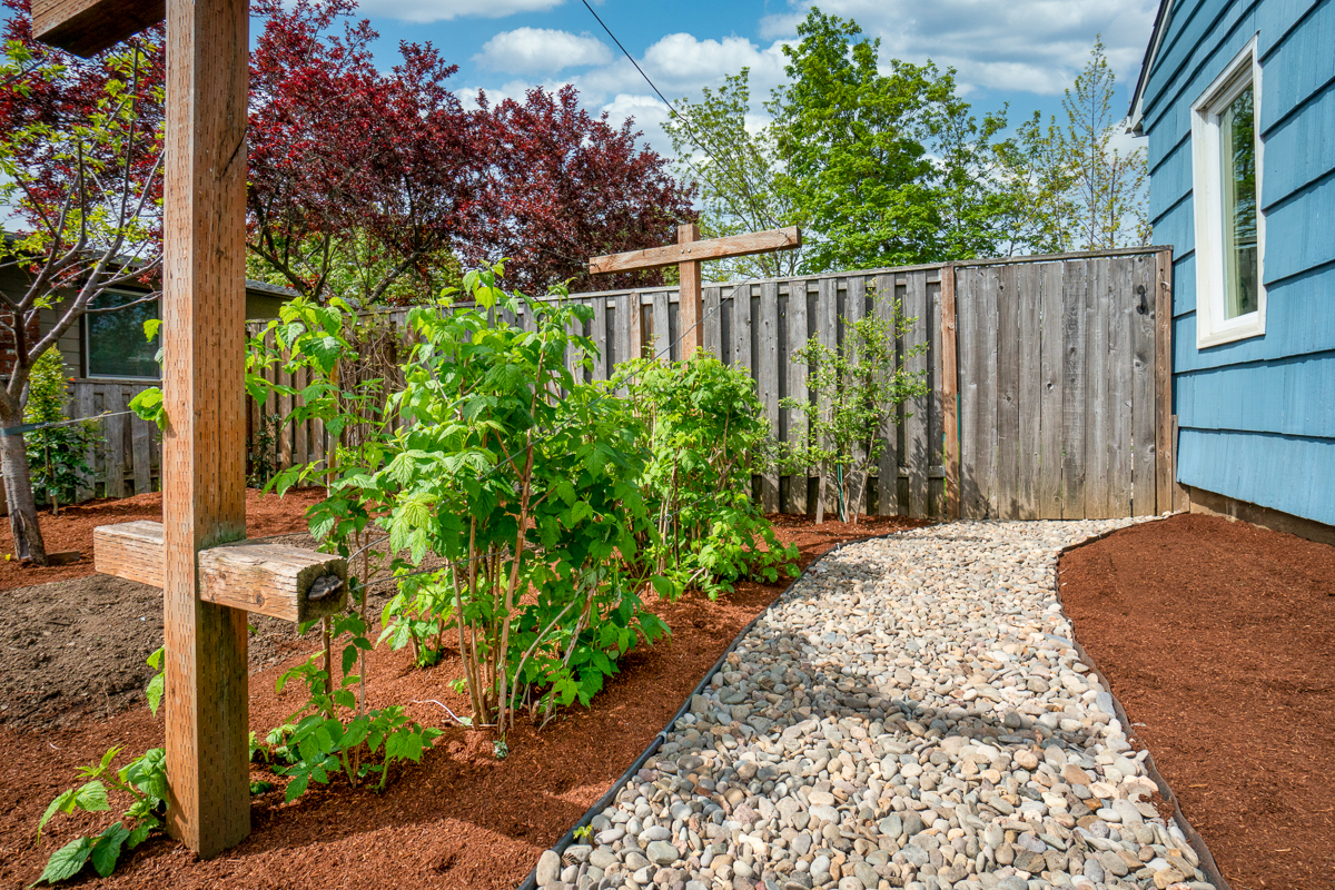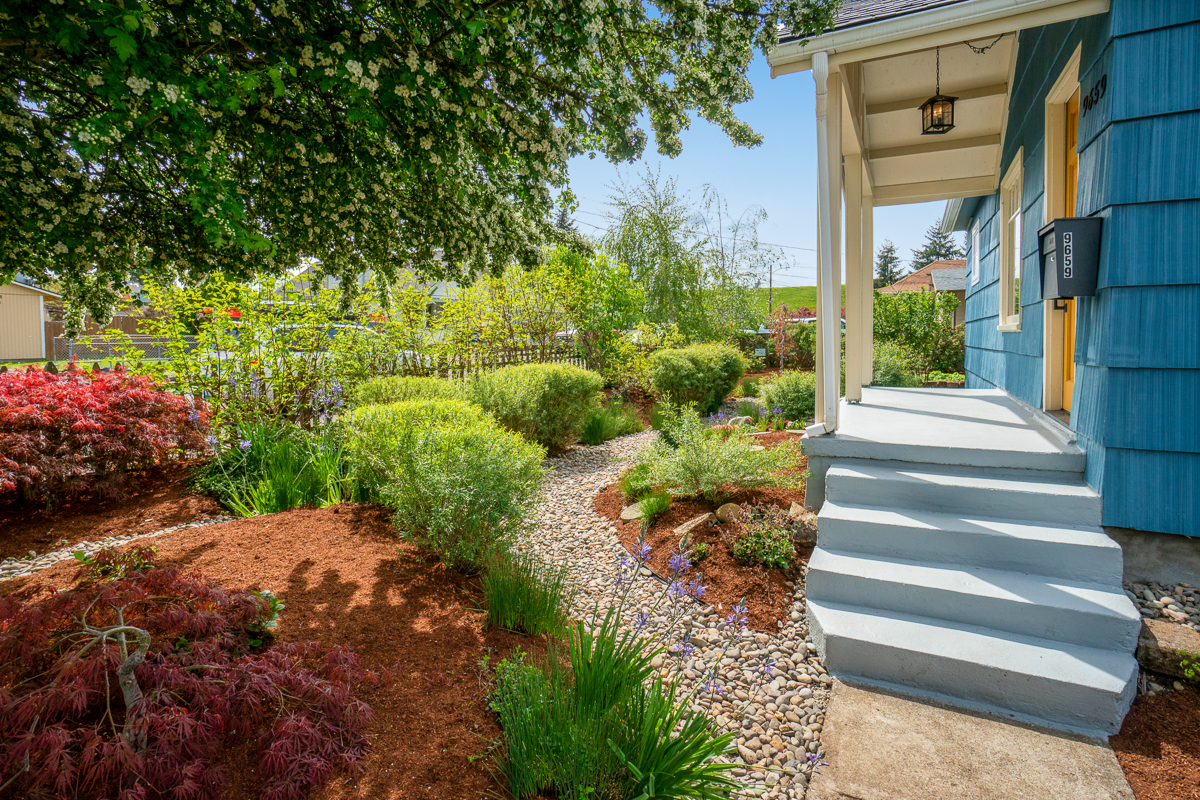 The large yard features low maintenance edibles and natives, a sunny patio and front porch, double