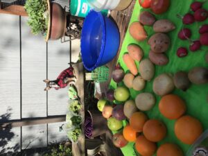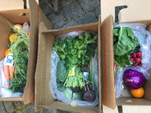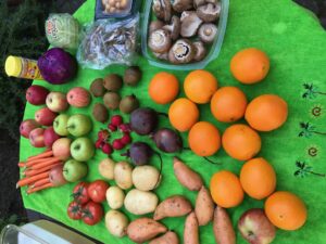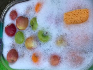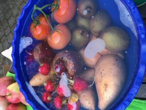 Produce gets delivered, soaked in soapy water, rinsed, dried under the supervision of Bender, the Real Estate Dog and Ruby, the cat, from her catio.