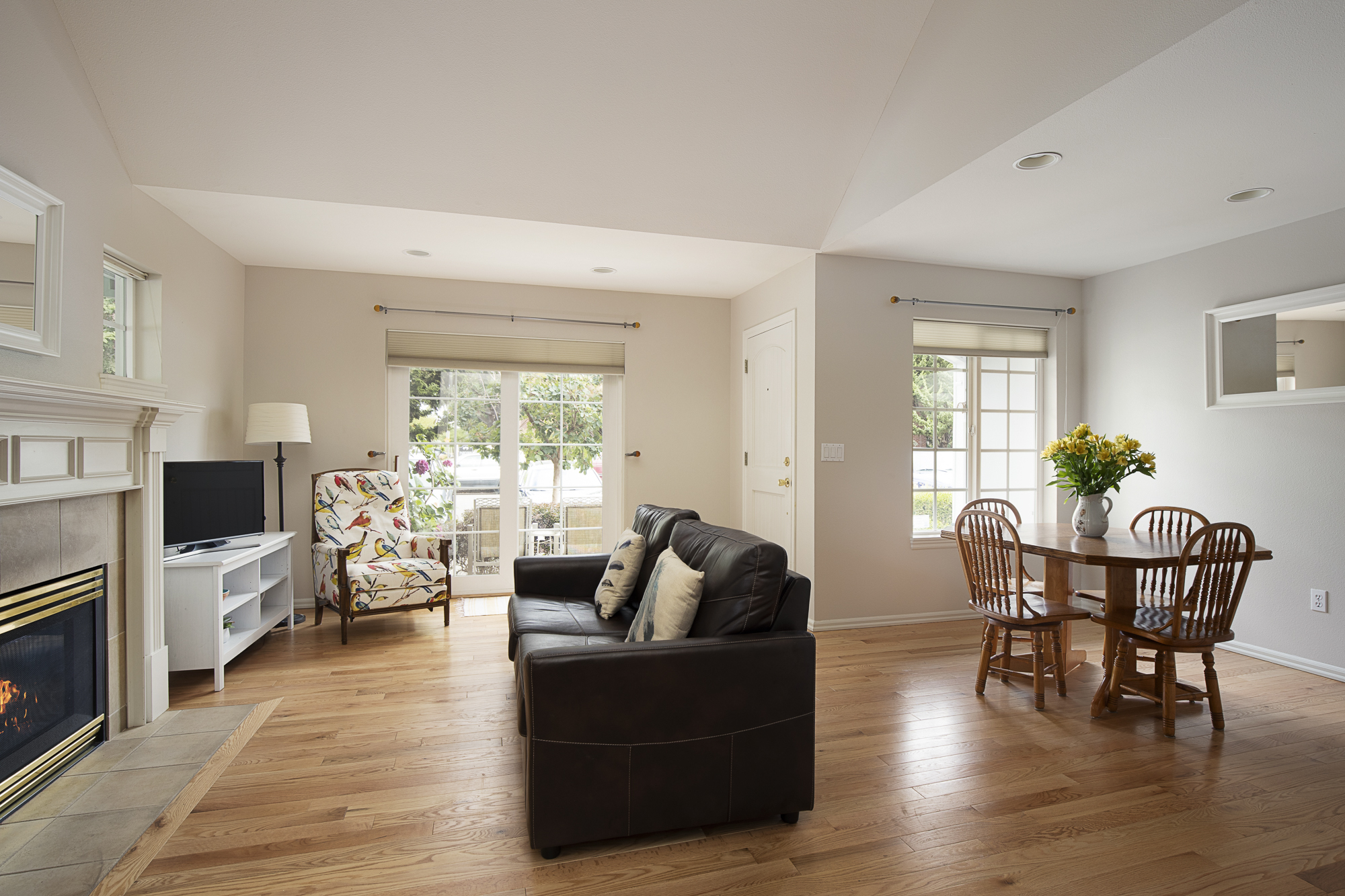Light and bright townhome on tree-lined street sits off the beaten path, but in the heart of the city! Near everything: 87 walk score and 100 bike score! Enjoy your oasis in the city from 2 patios, or stay cozy inside any season with A/C and new furnace  plus a gas fireplace. End unit with open floor plan, new hardwood and carpet. 2 bedrooms and 2 full baths up, half bath and den on the main. Attached garage, home warranty. No HOA fee! HES 6