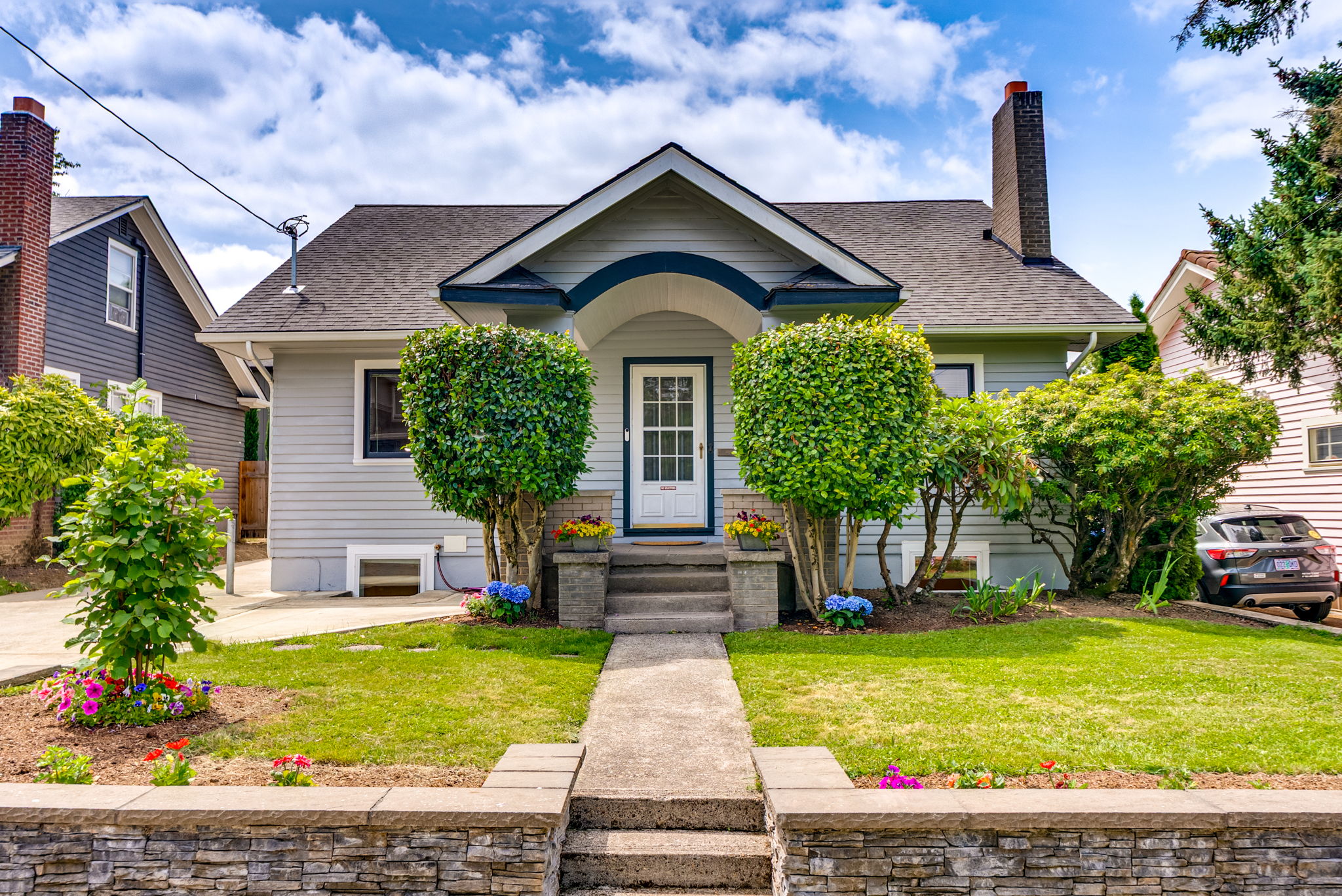The outdoor spaces feature a full parking strip vegetable garden, perimeter flower beds, mature shrubs, and a very private, fully enclosed backyard with a small lawn and two covered patios.
