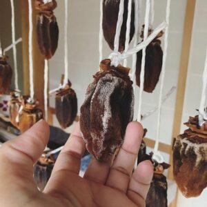 Here’s how Serious Eats explains Hoshigaki: “In Japan, Hachiyas are turned into a popular sweet, Hoshigaki, which is made by peeling the ripe fruit, hanging it carefully from a pole, and gently massaging it every day so that its juices evaporate and its sugars are drawn out to coat the exterior. The result is sweet and dense and slightly chewy—the Kobe beef of dried fruit.”