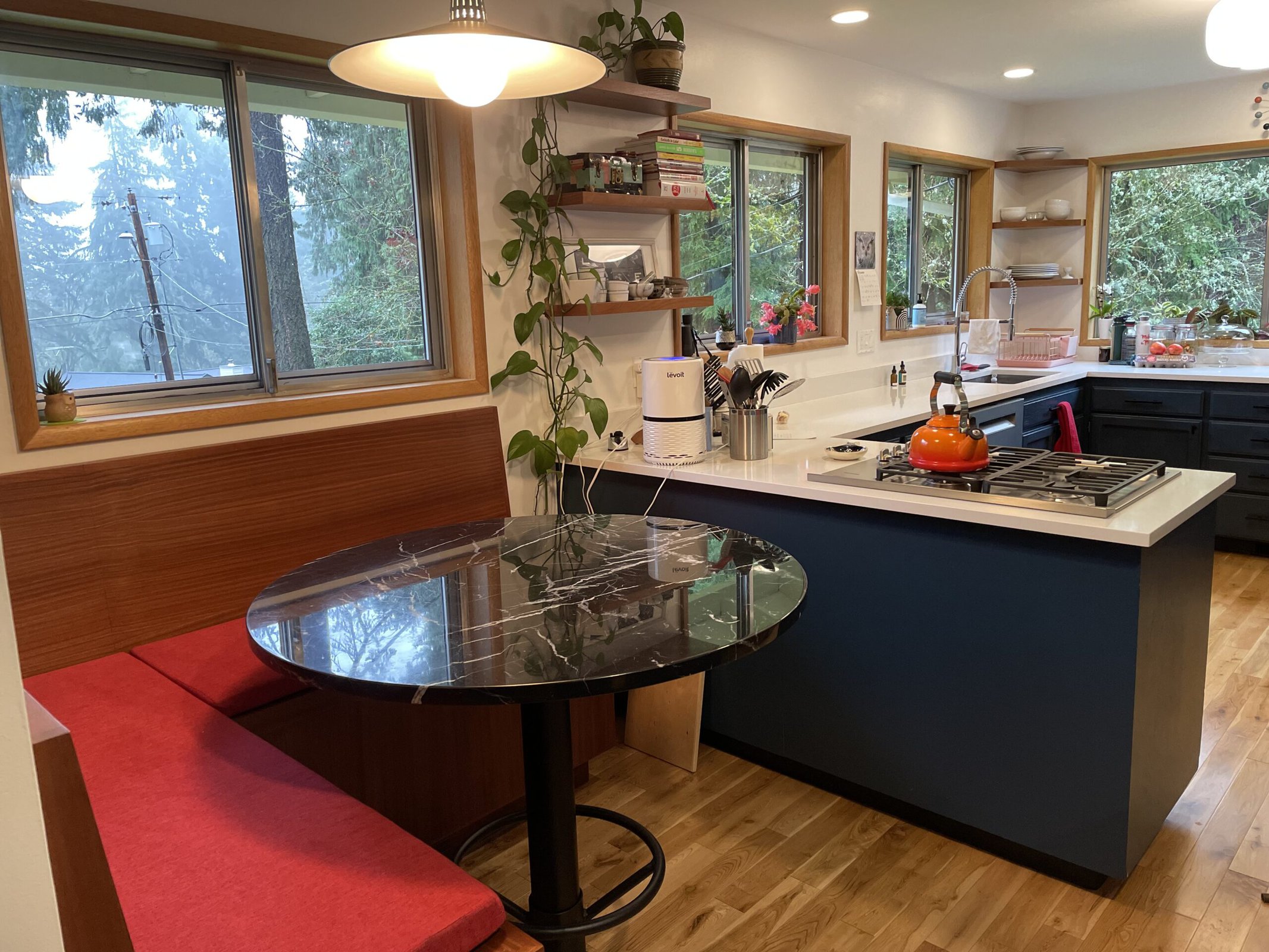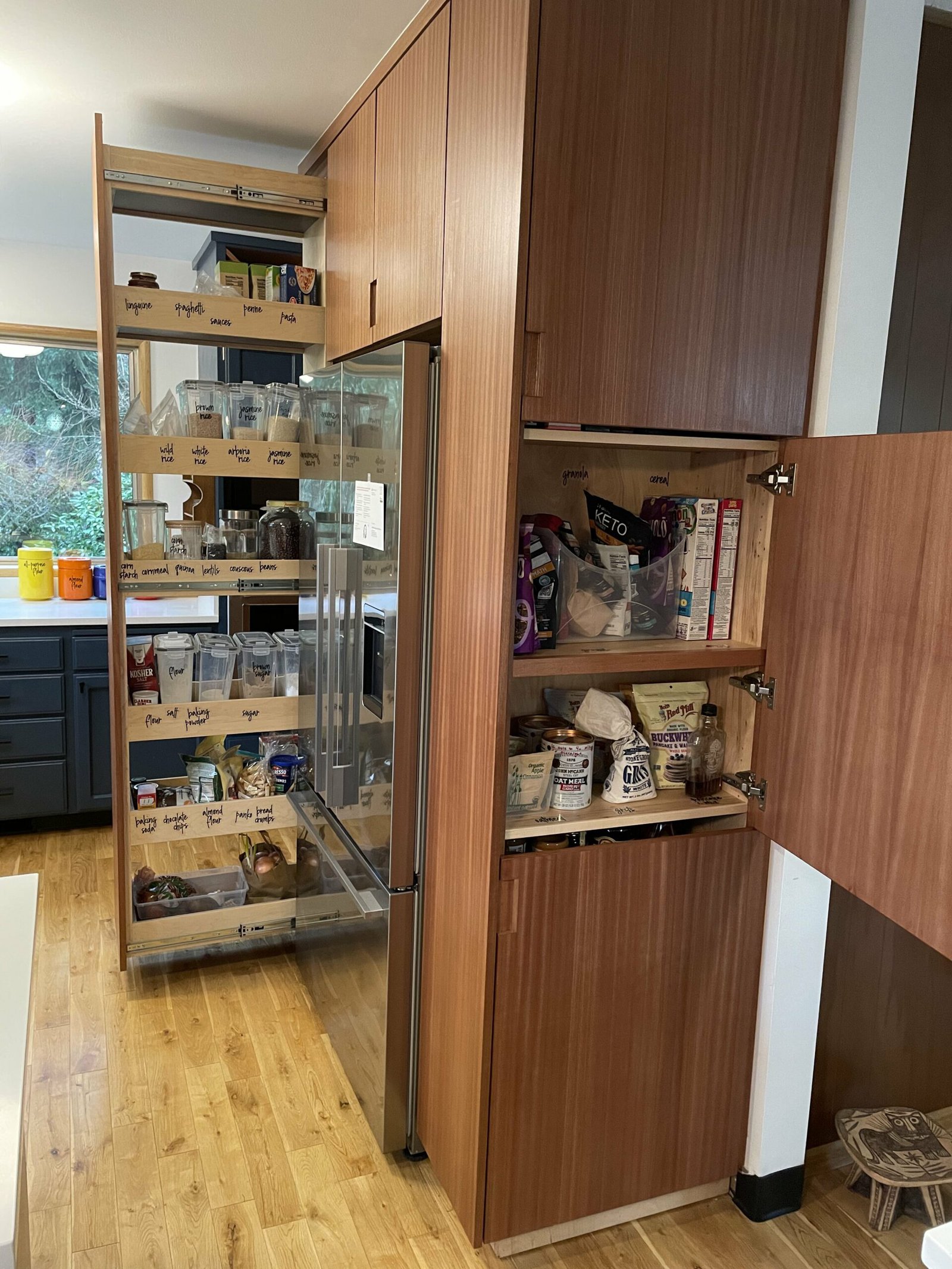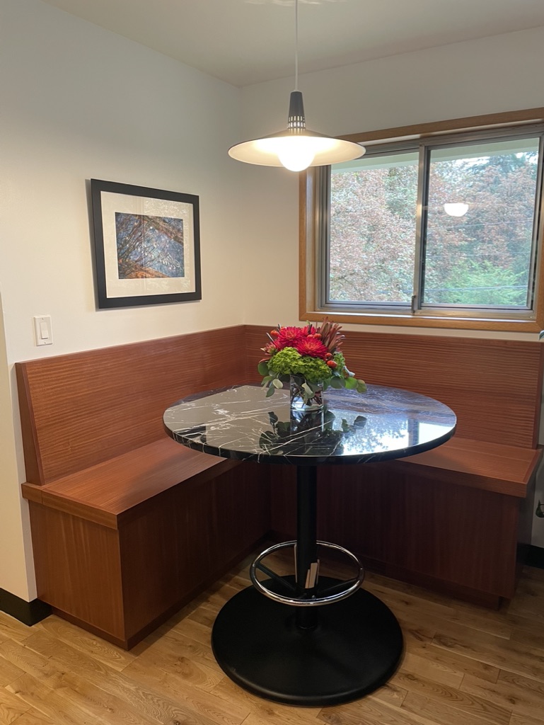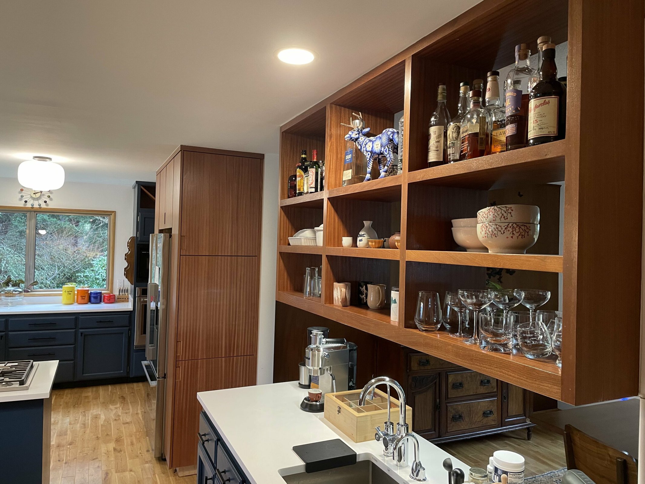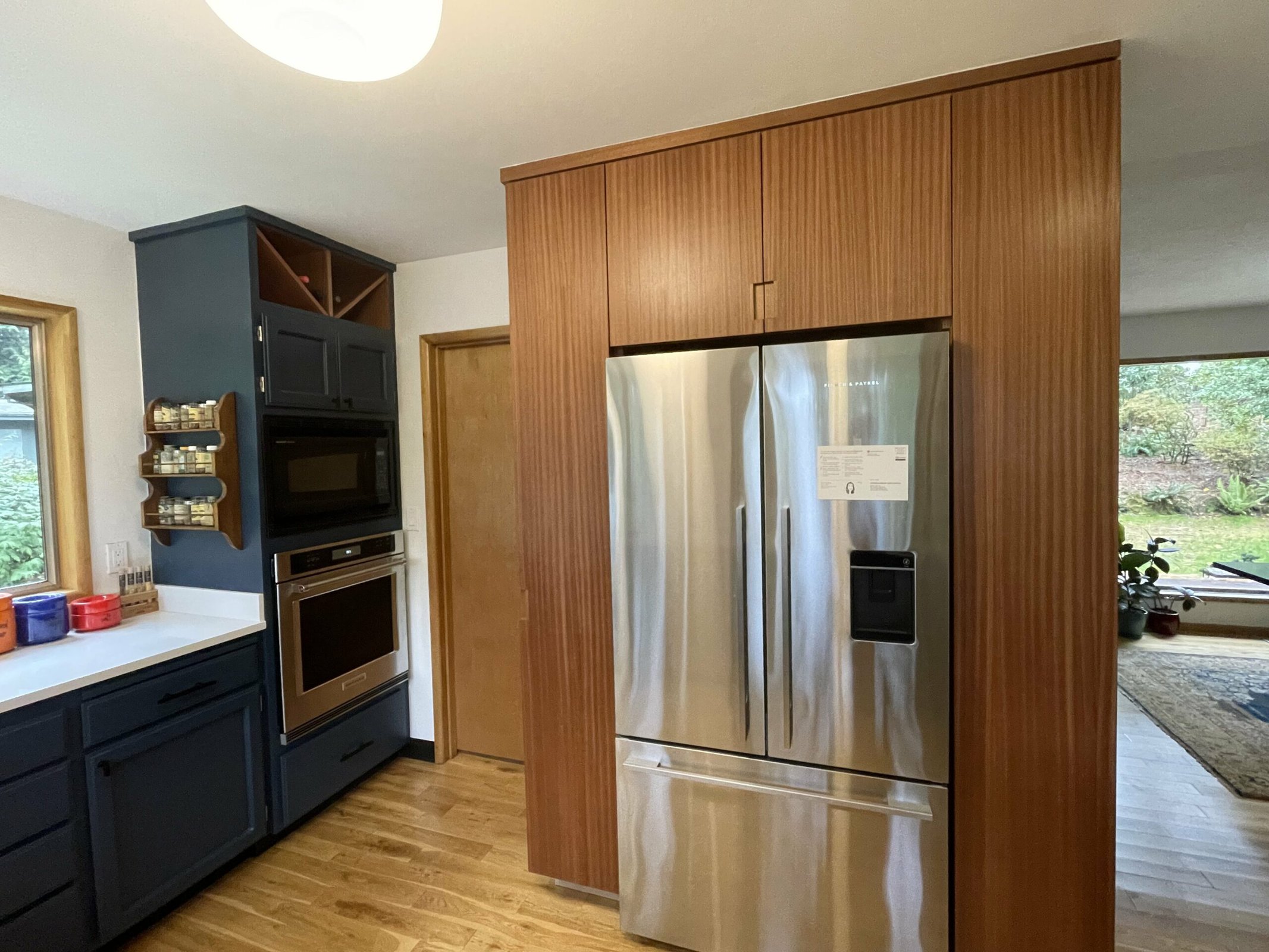 I first hired Jason to build a built-in cabinet at my Portland house several years ago. He told me from the get-go that he’ll build it but I have to finish it (or someone else). Anyone who knows me knows I’m not afraid of some hard work. Fast forward, my husband and I have been in our Milwaukie home for just over 5 years now and we’ve commissioned Jason for a handful more of projects. Specifically with Sapele wood. I love the appearance of Sapele grain when it is finished and it’s been a beautiful addition to my midcentury kitchen!