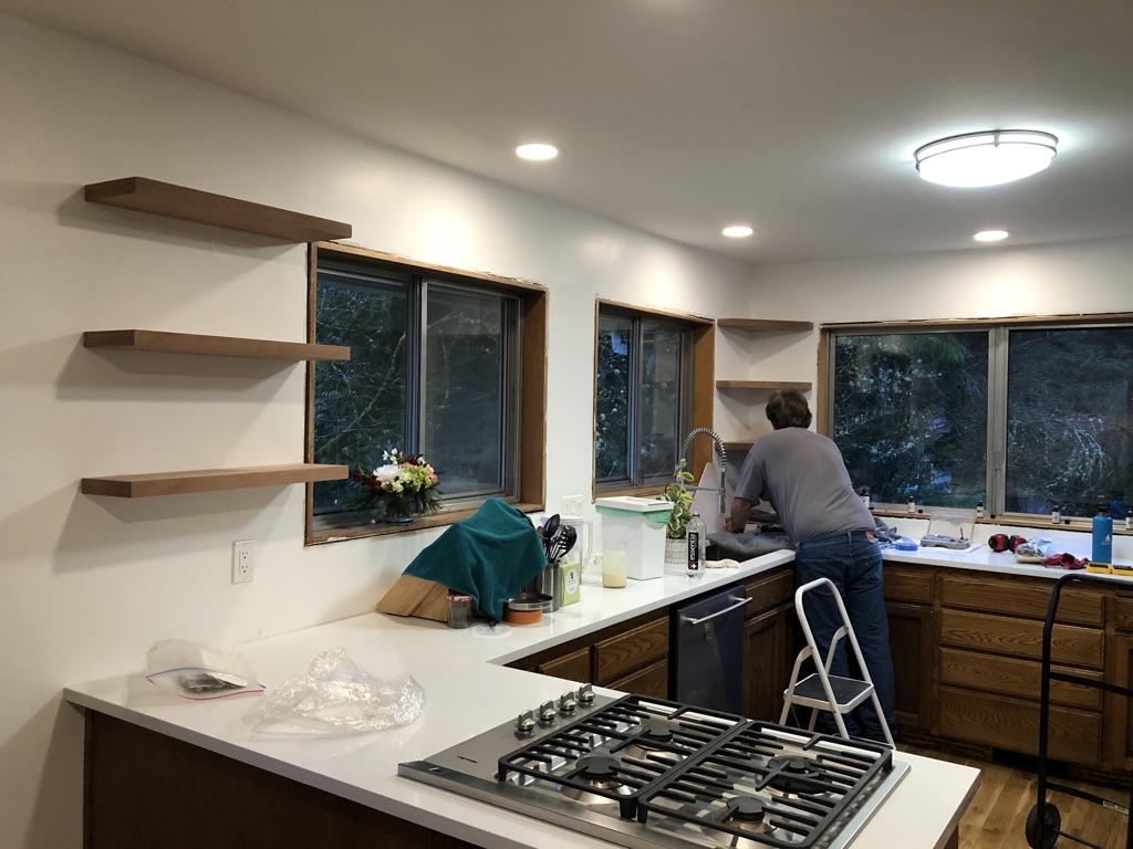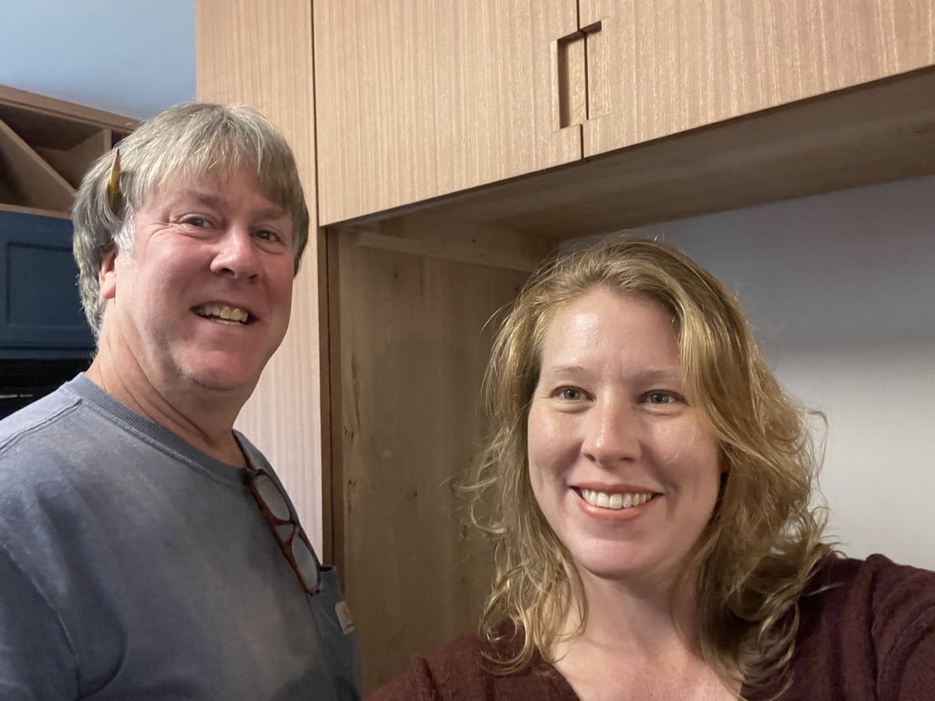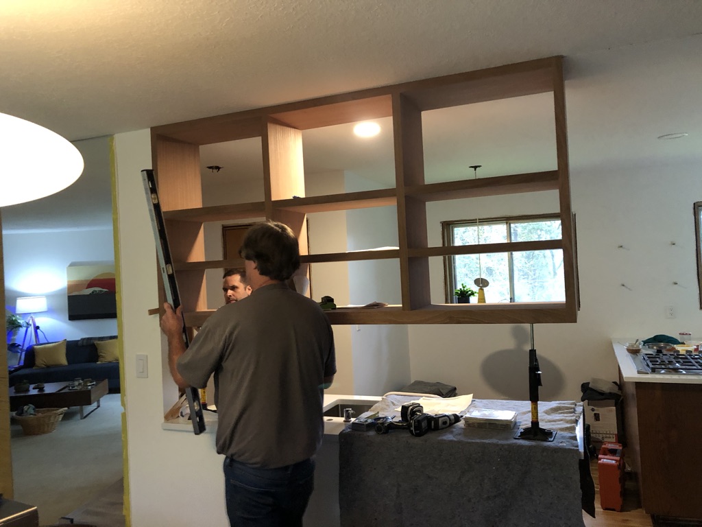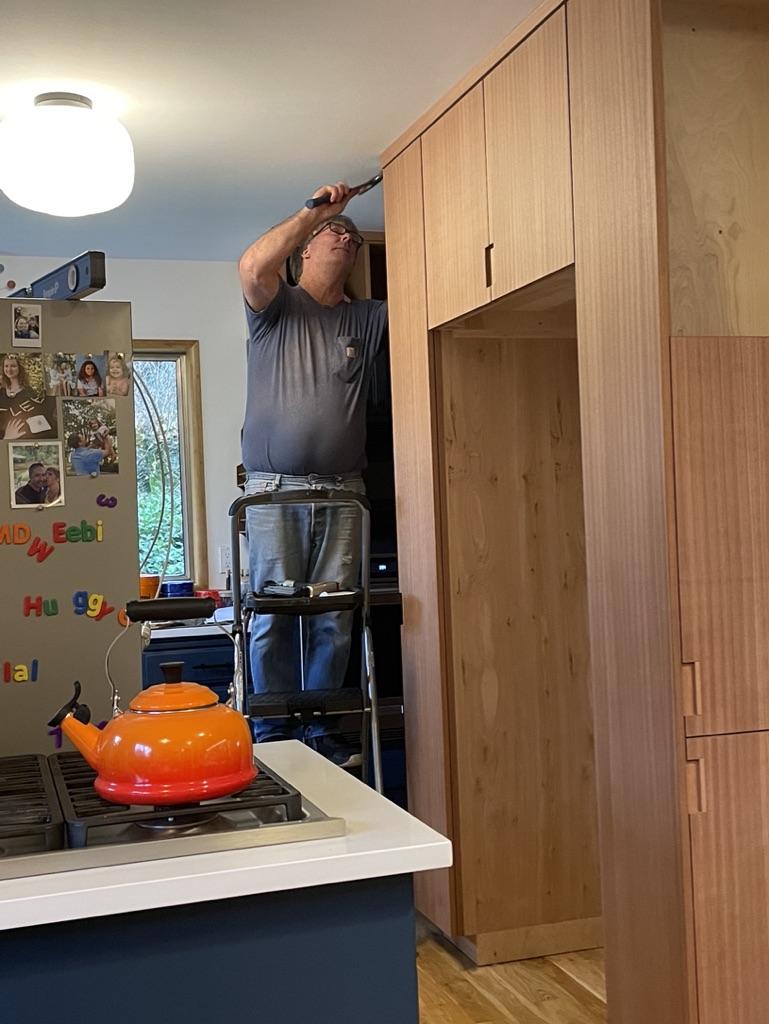 My most recent project is the fridge cabinet and because it went to the ceiling, we needed to add something over the oven so the cabinet matched. Viola a wine rack. Now my husband has asked him to build some special record cabinet, can’t wait to see how that turns out!