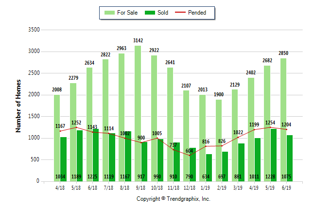 The patterns are what I find the most interesting about these market reports. Look below how similar the data pattern of pending sales and inventory are from April – July of 2018 and April – July of 2019. The same general shape with a peak in June for pending sales and then a slight dip. The same for inventory with it increasing month over month during that time period.