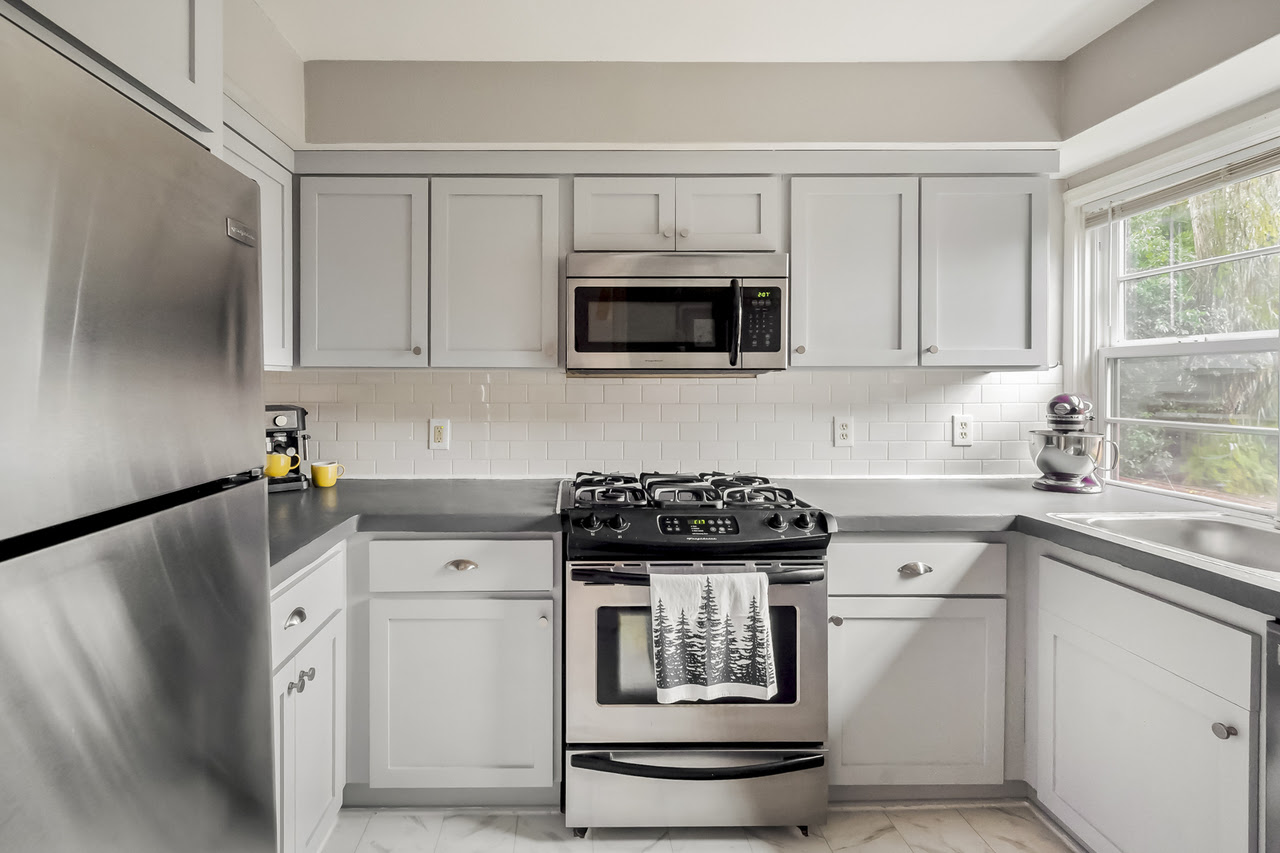 Inside, you’ll find a large living room, next to the charming dining room with fresh paint and a Murano glass light fixture. The kitchen is efficiently beautiful with stainless appliances, gas range, plenty of storage and counter space. The fresh paint, updated countertops, and new flooring in the kitchen will have you inspired to whip up many delicious meals here. Off a small hallway at the back of the condo is an in-unit washer & dryer, both bedrooms, and newly refreshed bathroom. With minimal steps to enter, located on the quietest corner of the complex, your parking space is a stone’s throw away. Ample closet space as well as private storage unit in the basement gives you a secure place for your things.