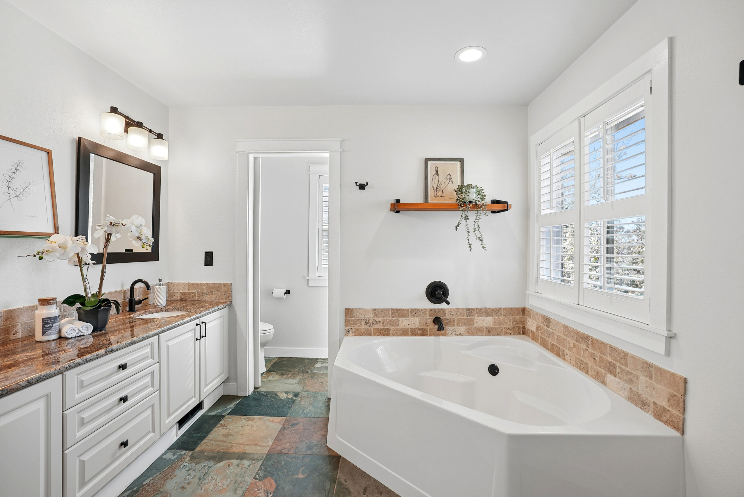The kitchen features warm wood cabinets, granite countertops, new appliances, and a breakfast area connected to a living room with a wood-burning fireplace and opening out onto a covered, screened-in porch – an ideal spot for morning coffee or alfresco entertaining. Upstairs, the primary suite is a private oasis, complete with a box-beam ceiling, antique transom, and a luxurious bathroom. Three additional comfortable bedrooms, a second full bathroom, and a convenient upstairs laundry room round out the second floor.