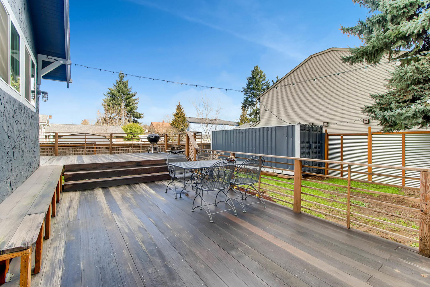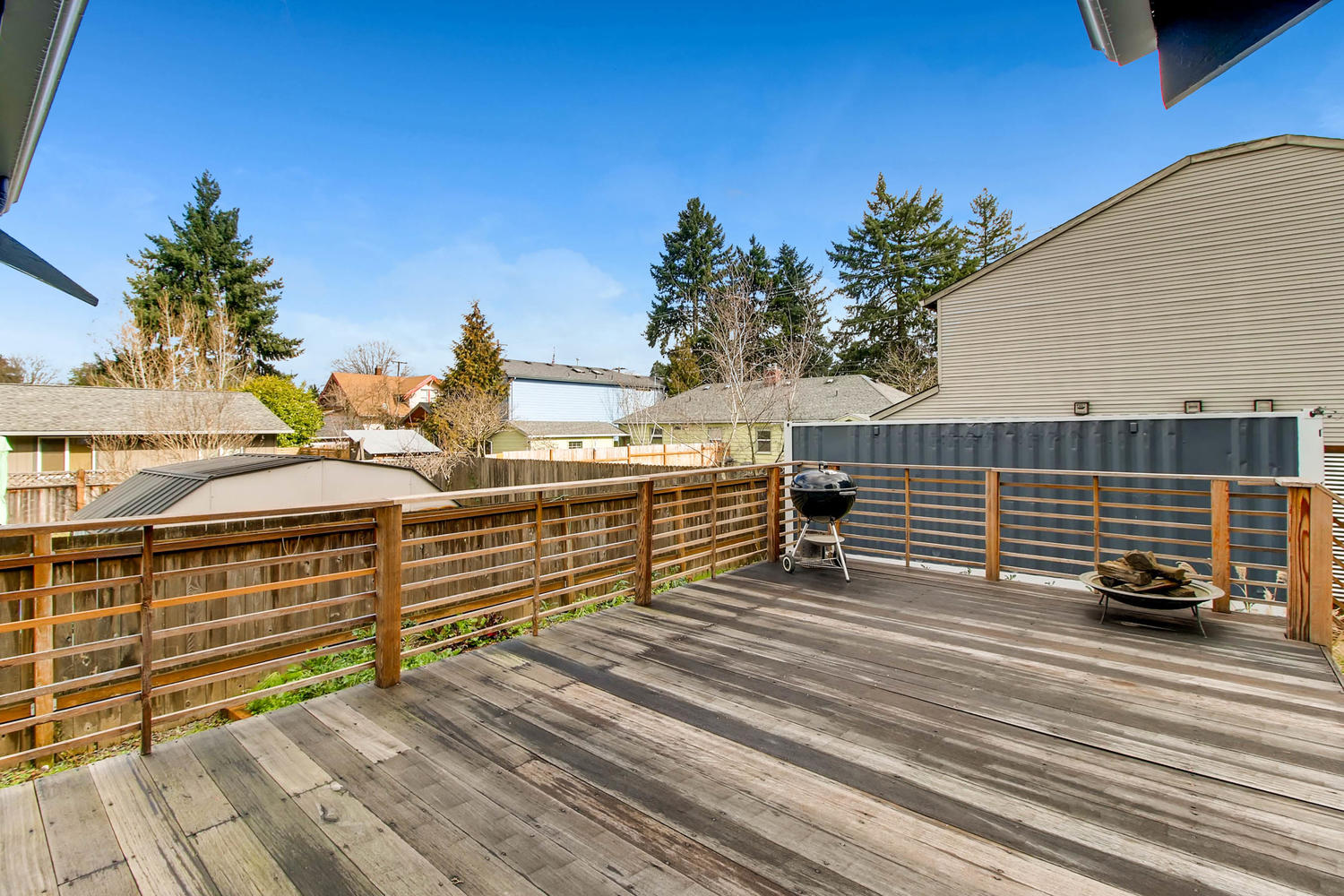 Great layout on main floor with open living room and kitchen. Two bedrooms on the main floor, one below in finished basement with egress window. Private fenced yard, deck, and TONS of storage. Literally. Shipping container has endless potential. Unbeatable location close to restaurants, coffee, and New Seasons on Woodstock. ZONED commercial (CG) yet a quiet residential street!