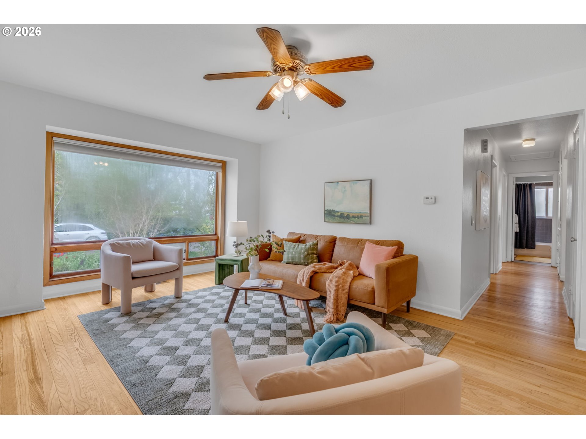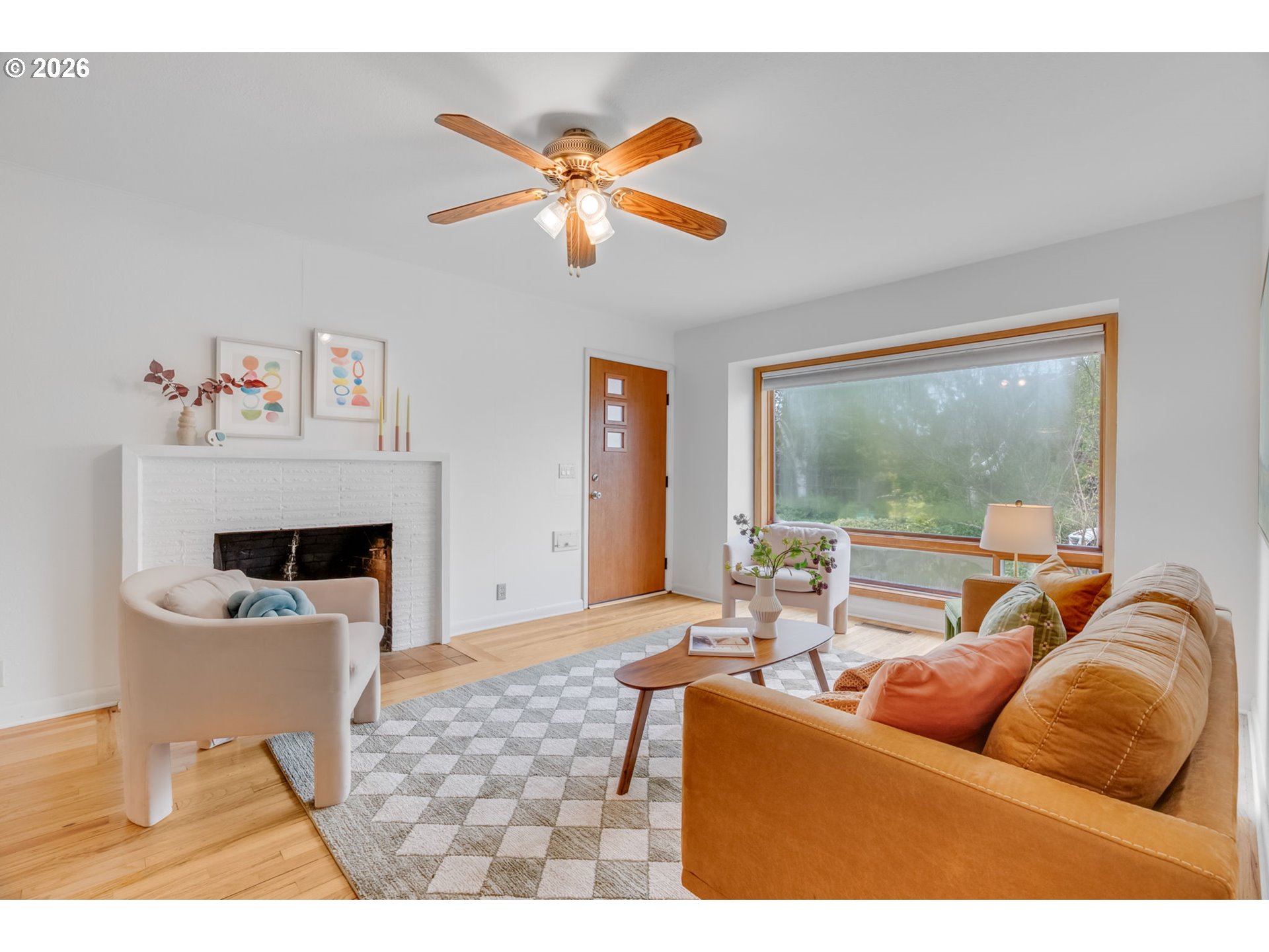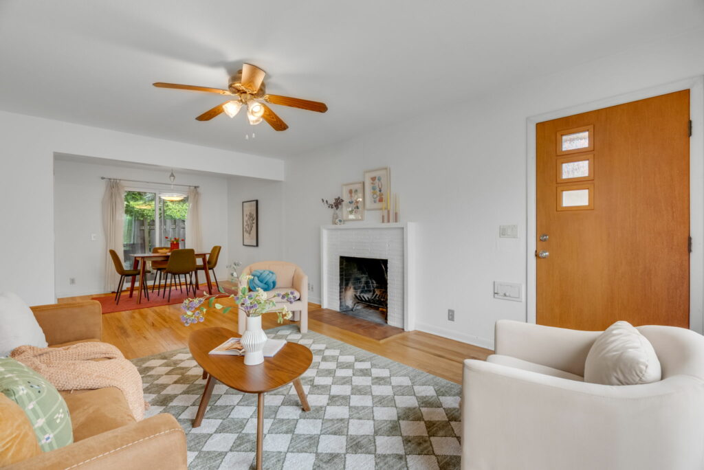 View ListingInside, warm hardwood floors run throughout a spacious living room anchored by a cozy wood-burning fireplace. A large picture window fills the space with natural light, creating an inviting atmosphere year-round. The adjacent dining room features a vintage 1950s light fixture and sliding doors that open directly to the backyard for seamless indoor-outdoor living.