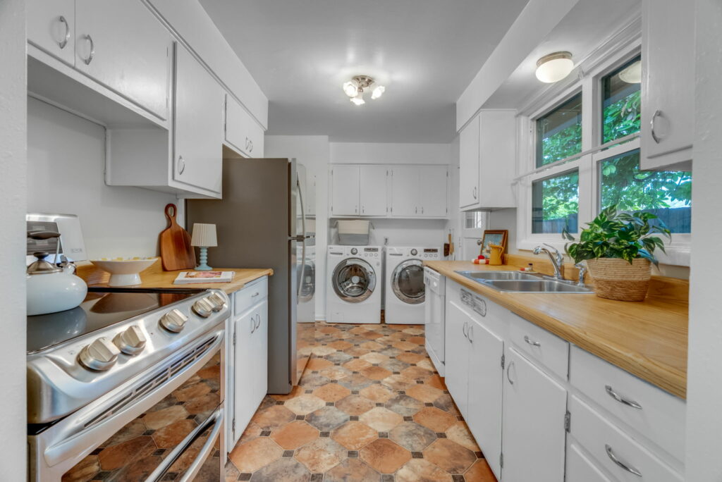 The efficient galley-style kitchen includes a washer and dryer, while the hallway leads to three bedrooms and an updated bathroom tucked at the end.