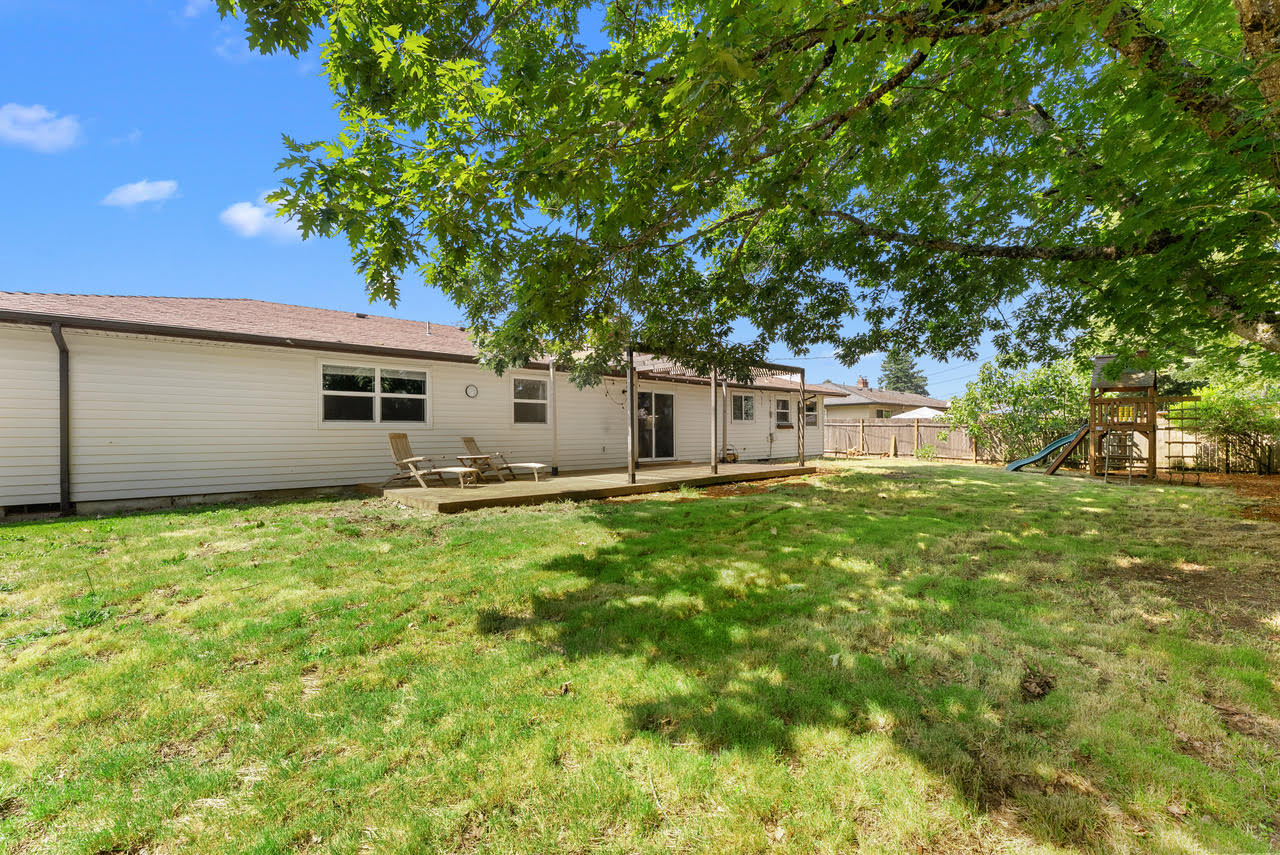 Oversized windows and woodstove in the living room offer delight all year round. Around the corner, the dining room and updated kitchen neighbor one another while bookended between the fireplace and sliding doors to the back yard. The fenced backyard includes a covered deck, play structure, lilacs, fig tree and a beautiful well established oak tree offering shade, beauty, and a great place to hang a swing.