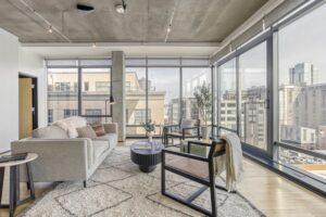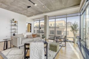 This northwest corner Pearl District condo knows how to show off. Two walls of floor-to-ceiling windows, high ceilings, stunning city and mountain views, the space is flooded with light from sunrise to sunset.