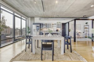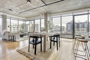 The oversized living and dining area is made for entertaining—whether it’s dinner parties, game nights, or a cozy night in with the skyline as your backdrop.
