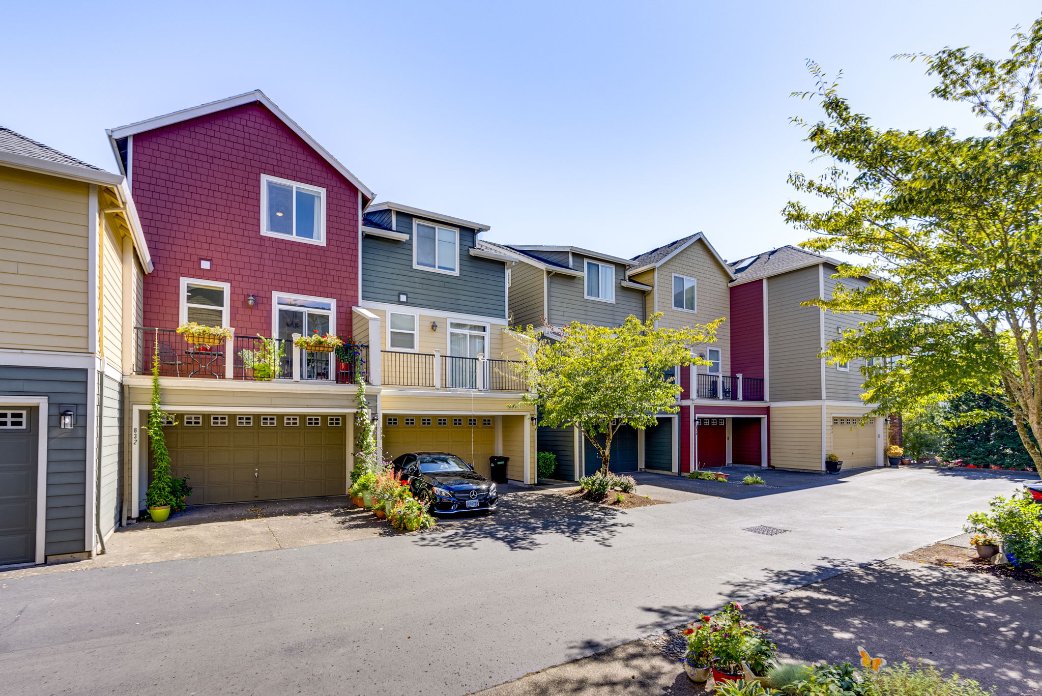 Welcome to your meticulously maintained, east-facing townhome boasting mountain views from the main and top floors. Step inside to be greeted by tall ceilings and abundant natural light, complemented by stylish up-down Hunter Douglas blinds on every window. Head up to the main floor and unwind in the spacious living room by the cozy gas fireplace—perfect for crisp fall evenings— or enjoy the view from the expansive windows or balcony. The bright, eat-in kitchen offers a breakfast bar and a dining area, with a slider that opens to a second, generously sized, sunny balcony ideal for outdoor dining, barbecuing, and cultivating your favorite herbs or flowers. The top floor offers two large, private bedrooms each with an en-suite bathroom, separated by the conveniently located laundry. On the first floor, discover a versatile bonus room or office complete with a full en-suite bathroom, easily convertible into a third bedroom with the simple addition of a door. This level includes the two-car garage and space for two additional vehicles in the driveway, providing ample parking and storage. Recent updates include fresh interior paint and all major appliances—including the washer/dryer, furnace, AC unit, water heater, and toilets— have been replaced within the past few years. Situated in a gated community adjacent to Gresham Station, this residence offers unparalleled convenience. Enjoy the local farmers market in historic Gresham and easy access to freeways, public transportation, and the airport. With a variety of restaurants, shops, and parks just moments away, everything you need is right at your doorstep.