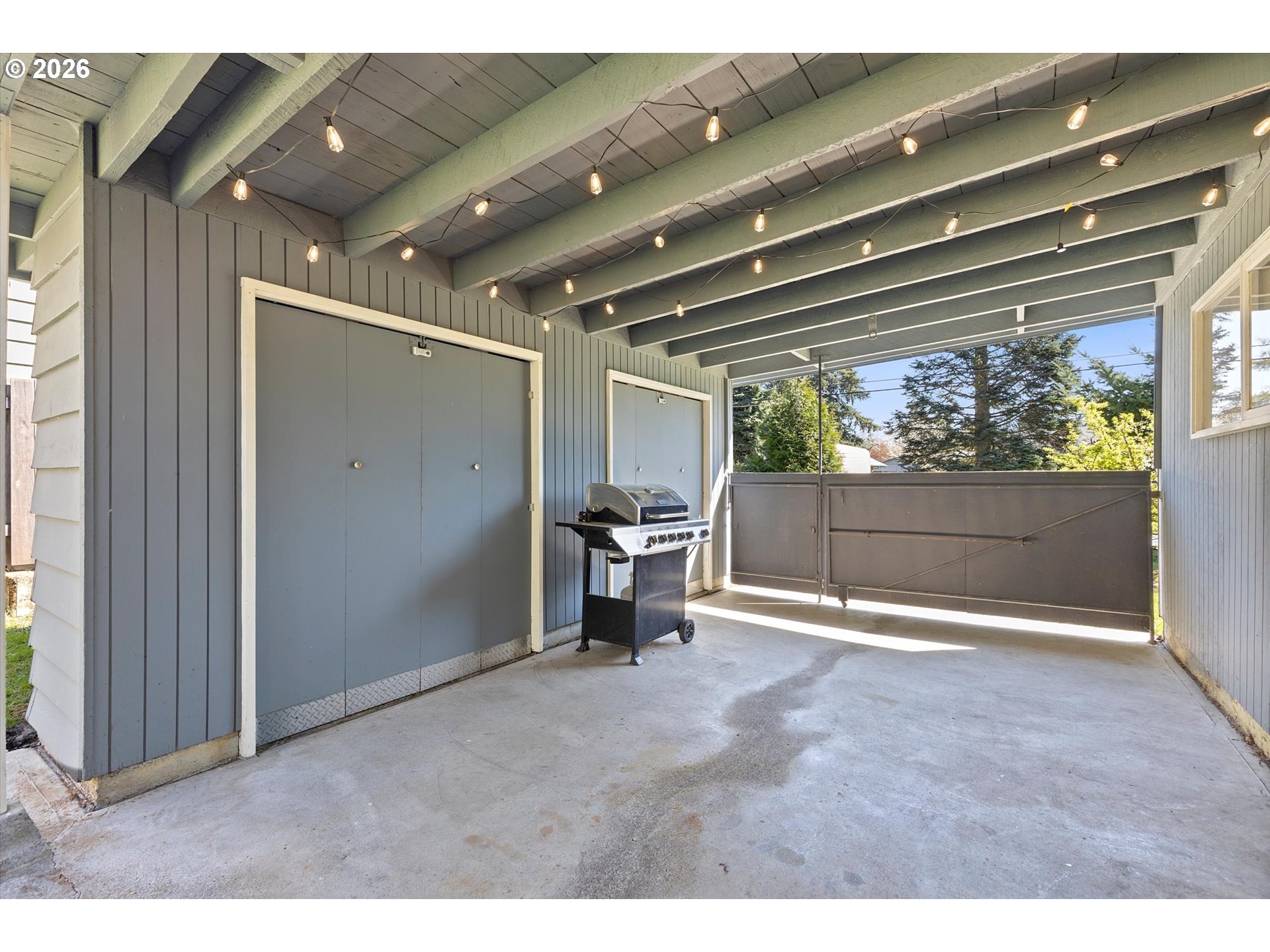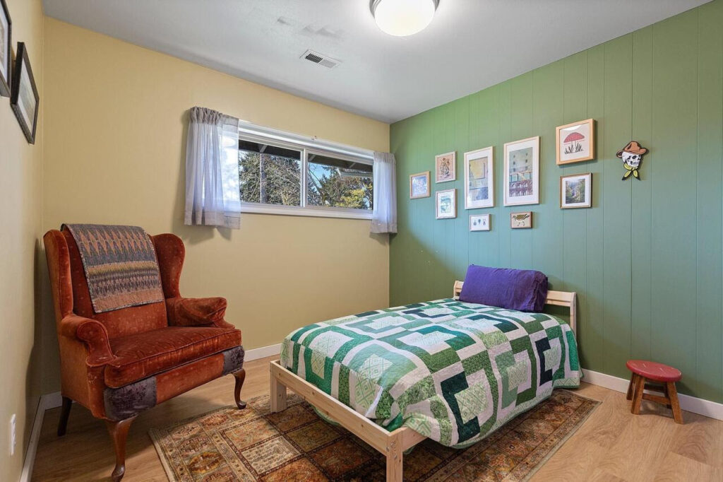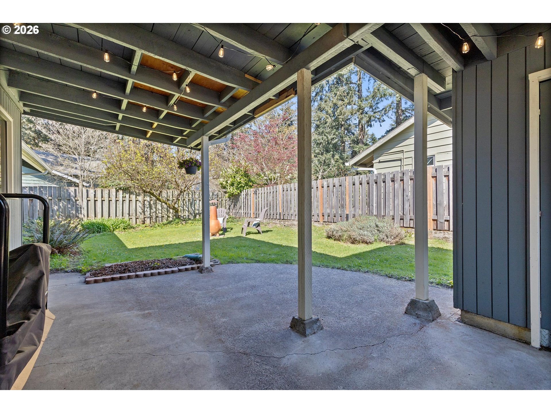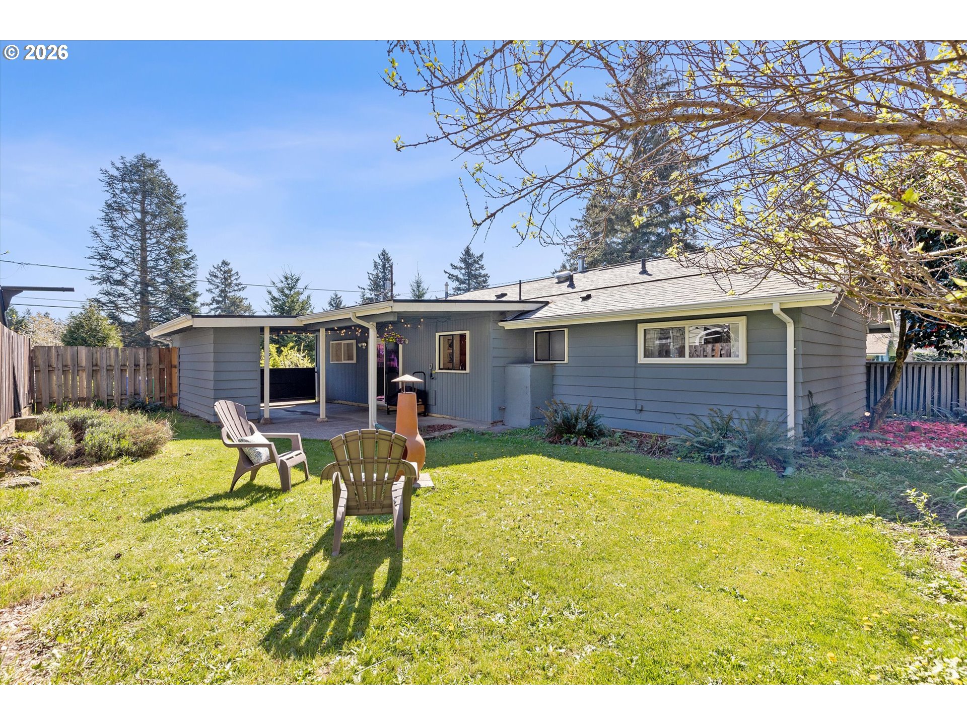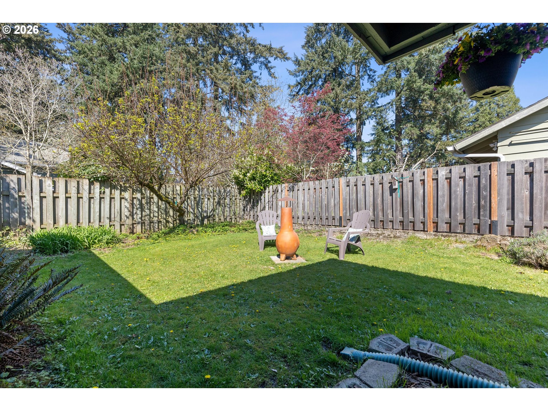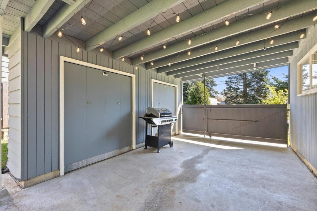 Outside, the fully fenced yard offers a rare urban orchard experience with mature cherry, apple, plum, and apricot trees, plus established berries, grapes, and raised garden beds. A covered outdoor area with string lights and a chiminea creates an ideal space for year-round entertaining.