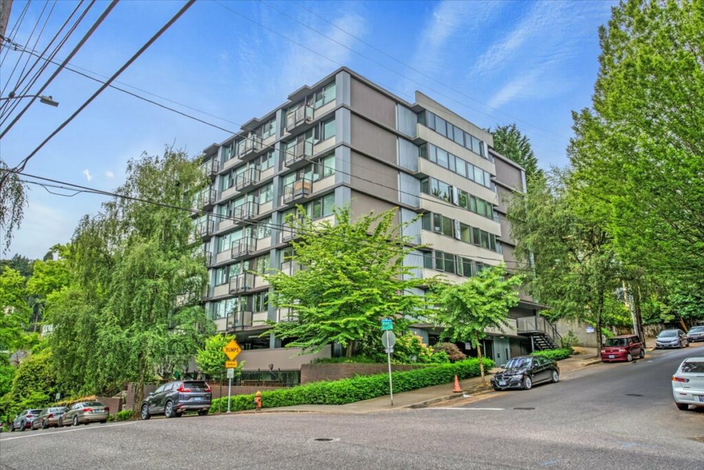 Stylish condo in an architecturally impressive 1962 mid-century modern building. Open atrium courtyard, elevator access to the quiet 7th floor SE corner unit. Huge windows on south side, new vinyl flooring, walk-in closet, deeded parking, storage unit. Highly desirable Goose Hollow location with easy access to downtown, Washington Park, MAX, Providence Park, PSU, OHSU, NW 23rd/Nob Hill, Pearl District. Perfect pied-de- tierre!