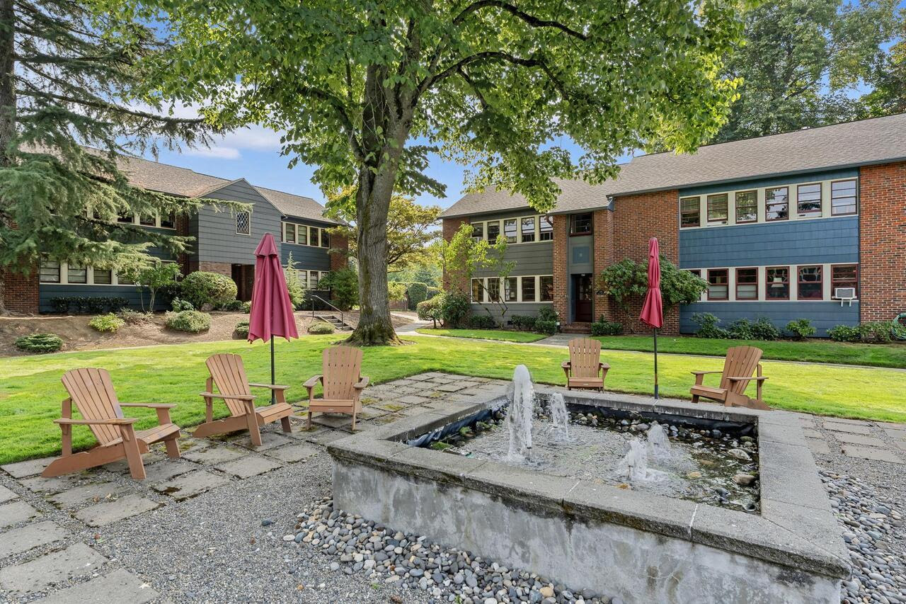 Gleaming hardwood floors & soaring ceilings greet you, while large living room windows frame tranquil views of the beautiful courtyard and fountain—your own slice of nature just outside your door! Enjoy cozy dinners & lively gatherings in the dining room, adjacent to the efficient handsome kitchen boasting stainless steel appliances incl dishwasher, slate tile countertops, a classic subway tile backsplash and rich wood cabinetry—blending form and function beautifully. Retreat to the spacious primary bedroom, where hardwood floors and serene courtyard views create a calming sanctuary. The light filled bathroom features a subway tile shower/tub combo, Marmoleum floors and thoughtful storage. Additional linen closets in the hallway and bathroom ensure everything has its place.