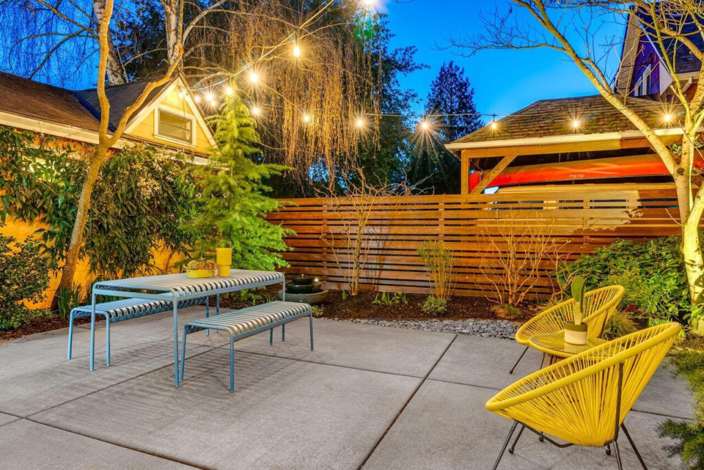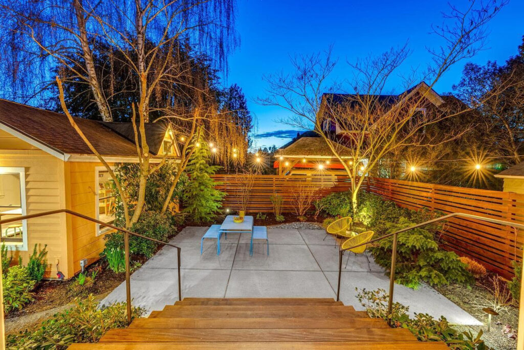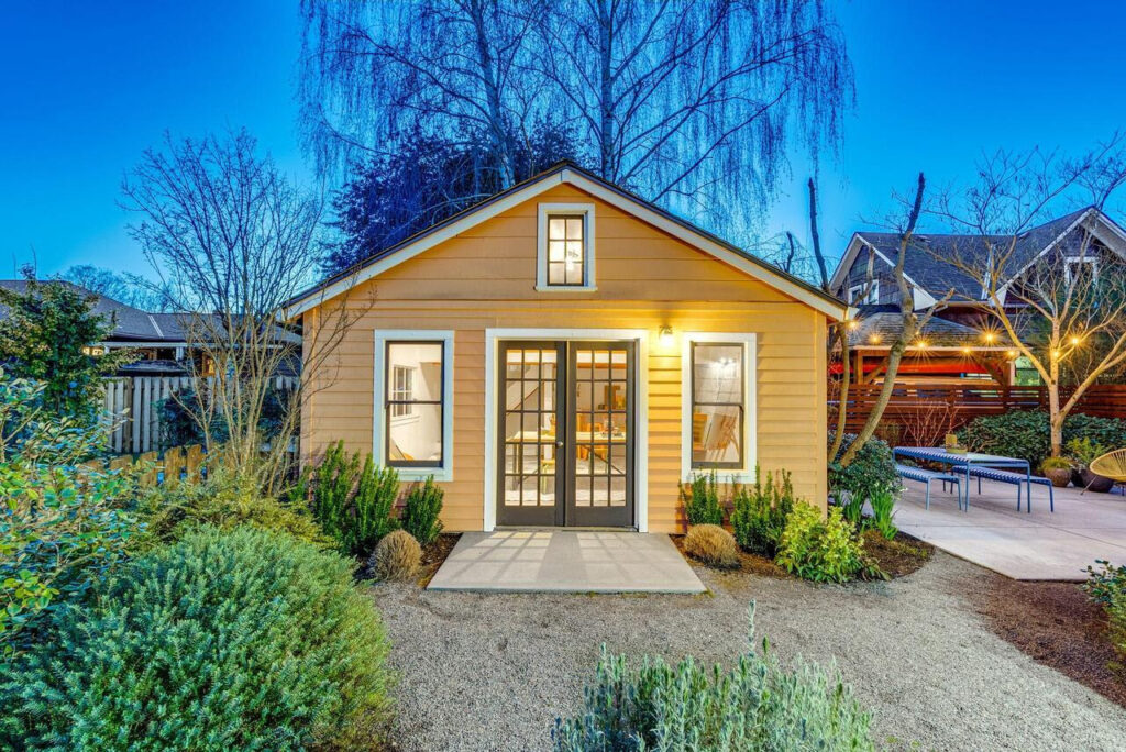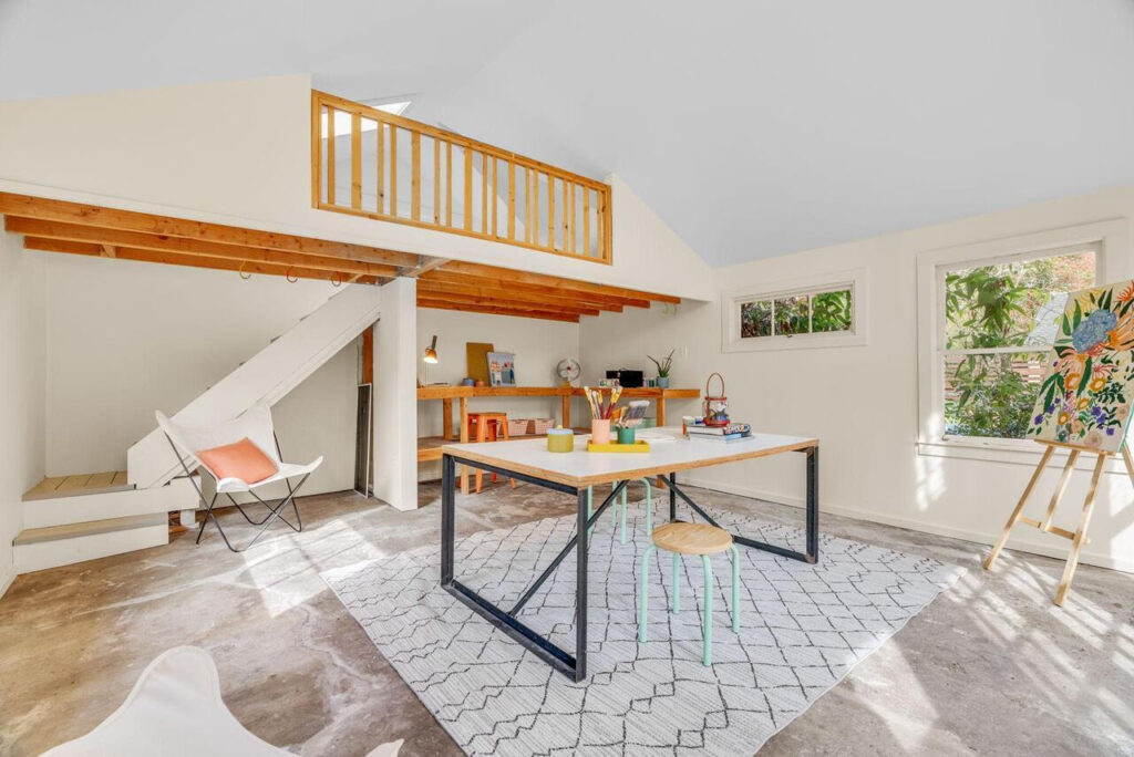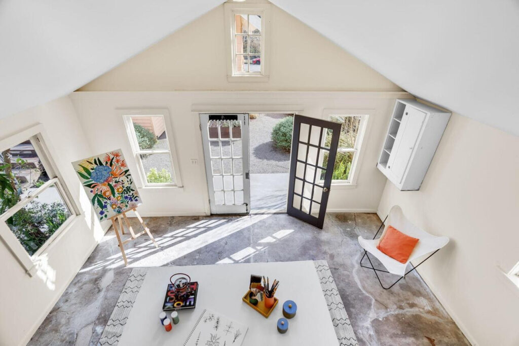 Outdoors, a private urban garden oasis awaits. The back patio transforms into an alfresco living room in warmer months, surrounded by lush plantings and a tranquil fountain. A detached artist’s studio adds rare versatility—perfect for a creative workspace, wellness studio, recreation lounge, or future ADU conversion (buyer to verify), creating additional lifestyle and investment upside.