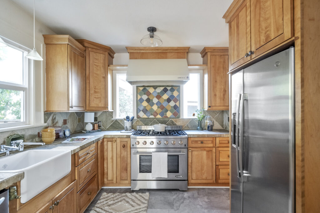 This welcoming home offers a relaxing backdrop for modern living, with open yet distinct spaces and tall ceilings that give a hint of grandeur. Well-appointed kitchen with stainless steel appliances, gas range, pantry, and wood cabinets offering ample storage, plus convenient half bath of kitchen.