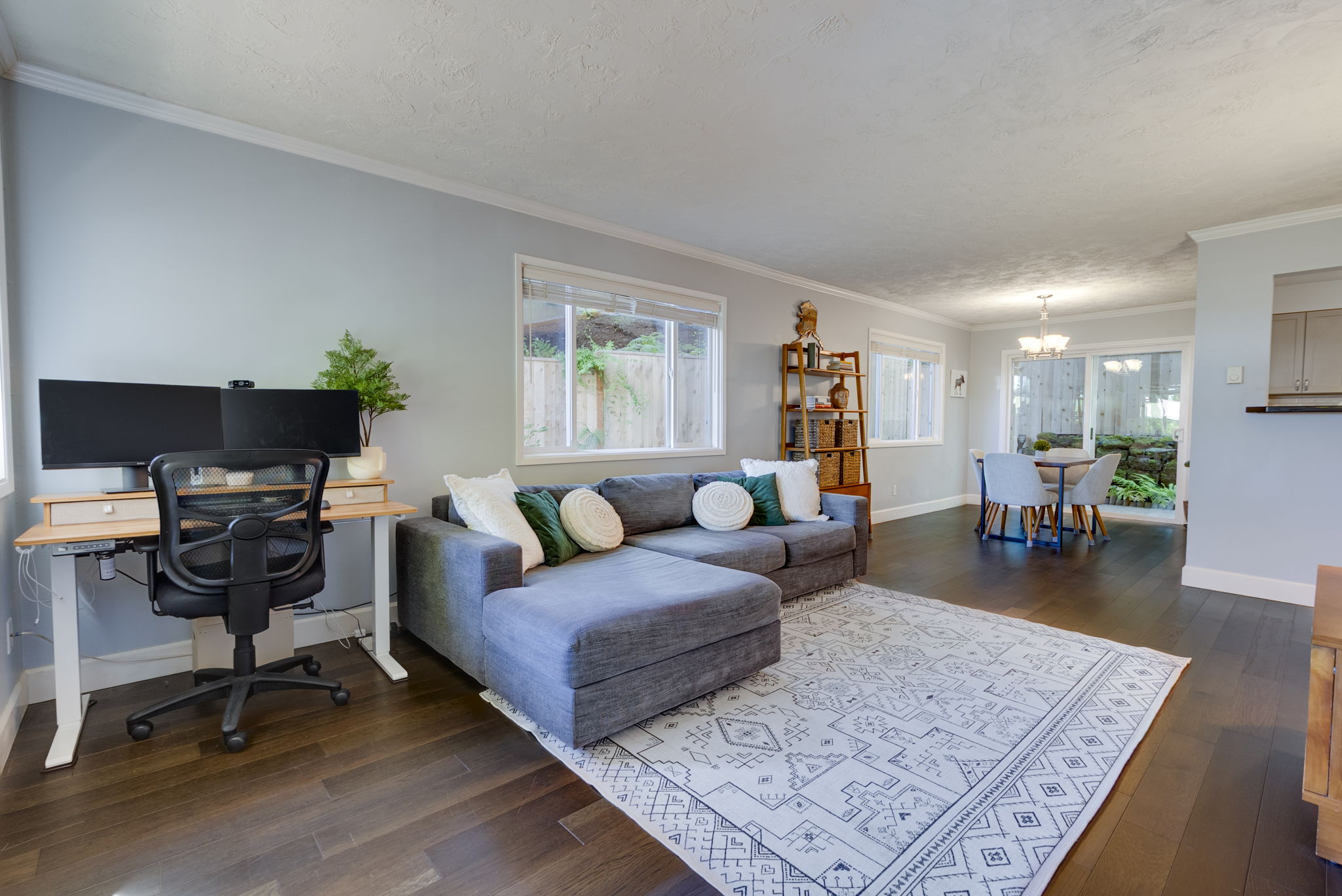Inside, fresh interior paint and modern touches—including a new bathroom vanity and energy-efficient double-pane windows—create a clean, move-in-ready backdrop for your life. The open floor plan flows easily from a spacious living area to a dining space that opens directly onto your private patio through sliding glass doors. Whether you’re hosting friends or enjoying a quiet night in, the layout is designed to make you feel at ease.