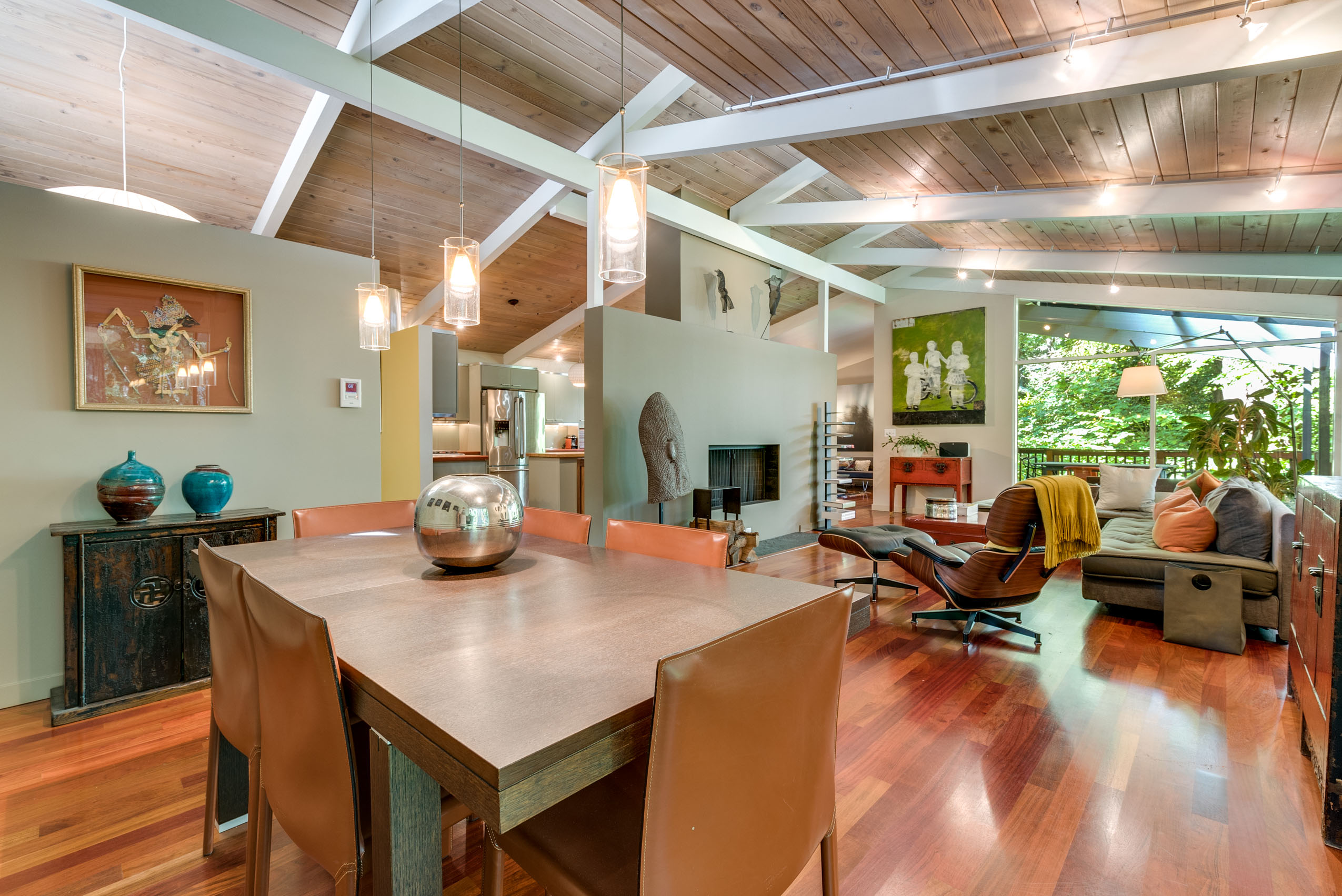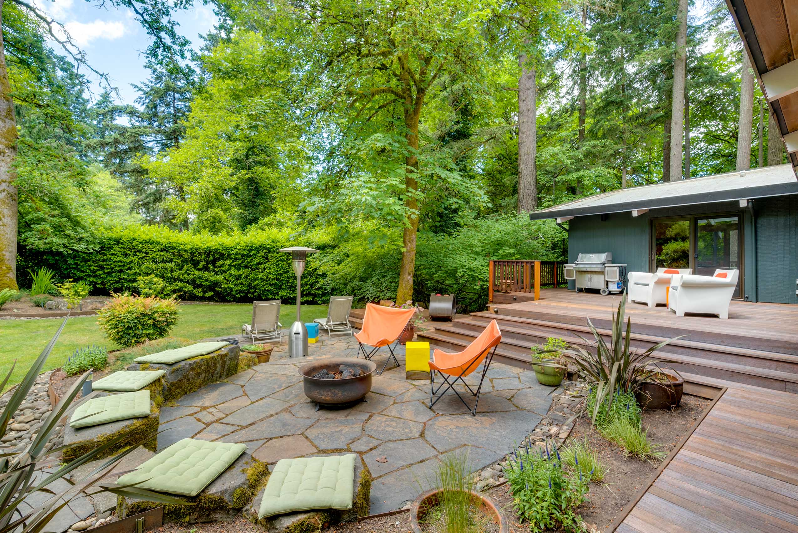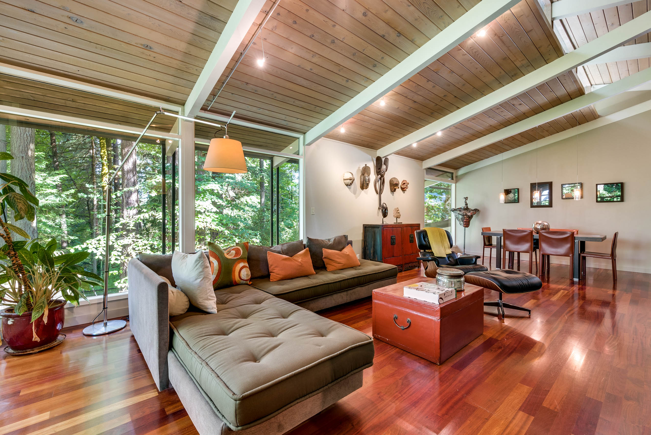 This home has been thoughtfully restored by owners who have a discerning eye for exquisite modern design and finishes. The main level features vaulted, tongue and groove wood ceilings with exposed beam detail, Brazilian cherry hardwood floors and floor-to-ceiling windows over-looking the forested landscape. Fully renovated kitchen opens to the dining and living room. The private master suite includes heated tile floor, skylights, and a Duravit sink in the bathroom. New energy efficient windows and solid core interior doors throughout. Gorgeous Mahogany decking wraps around the back of the house tying into the multi level stone patios surrounded by modern landscaping, perfect for entertaining.