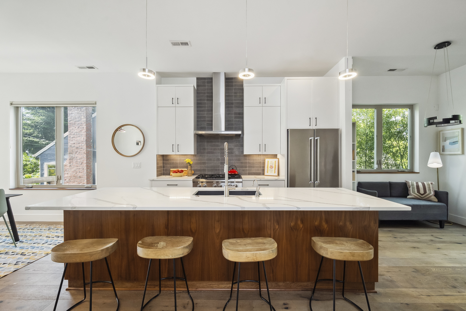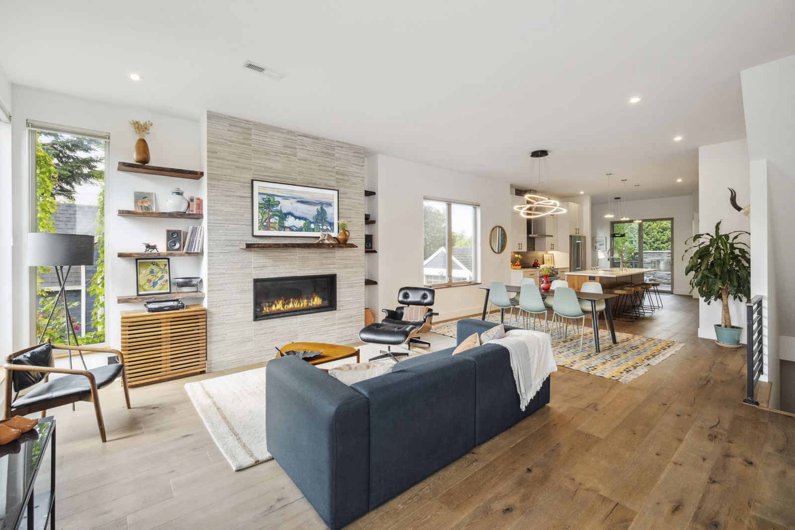 The home greets you with colorful, blooming perennials from spring through summer and a cozy front porch that invites you to slow down and stay awhile. Step inside to soaring ceilings and tall corner windows that flood the space with natural light throughout the day. Gorgeous wood floors lead you through the open-concept main level, where the living room centers around a sleek gas fireplace—perfect for cozy evenings. The dining area flows seamlessly into a spacious, modern kitchen featuring a large island with bar seating, a gas range, ample storage, and a sweet built-in coffee bar. A main-floor home office adds flexibility for remote work or creative space.