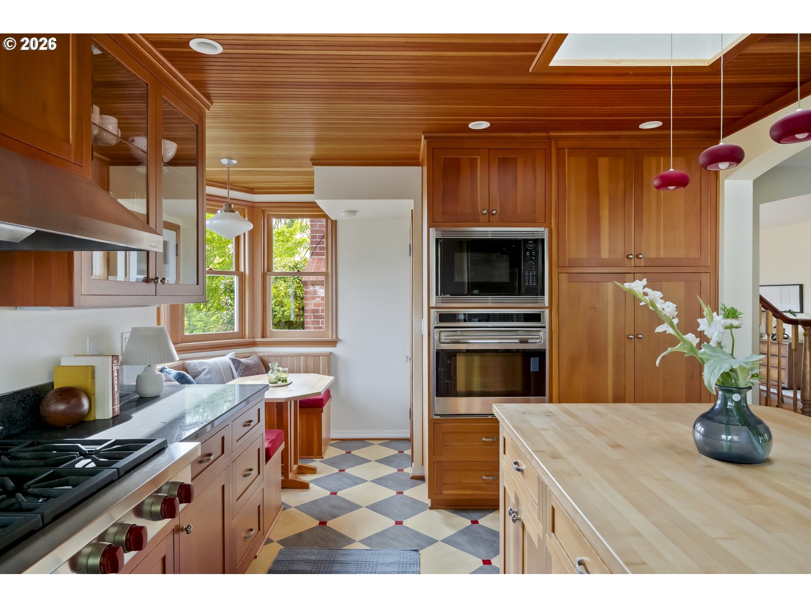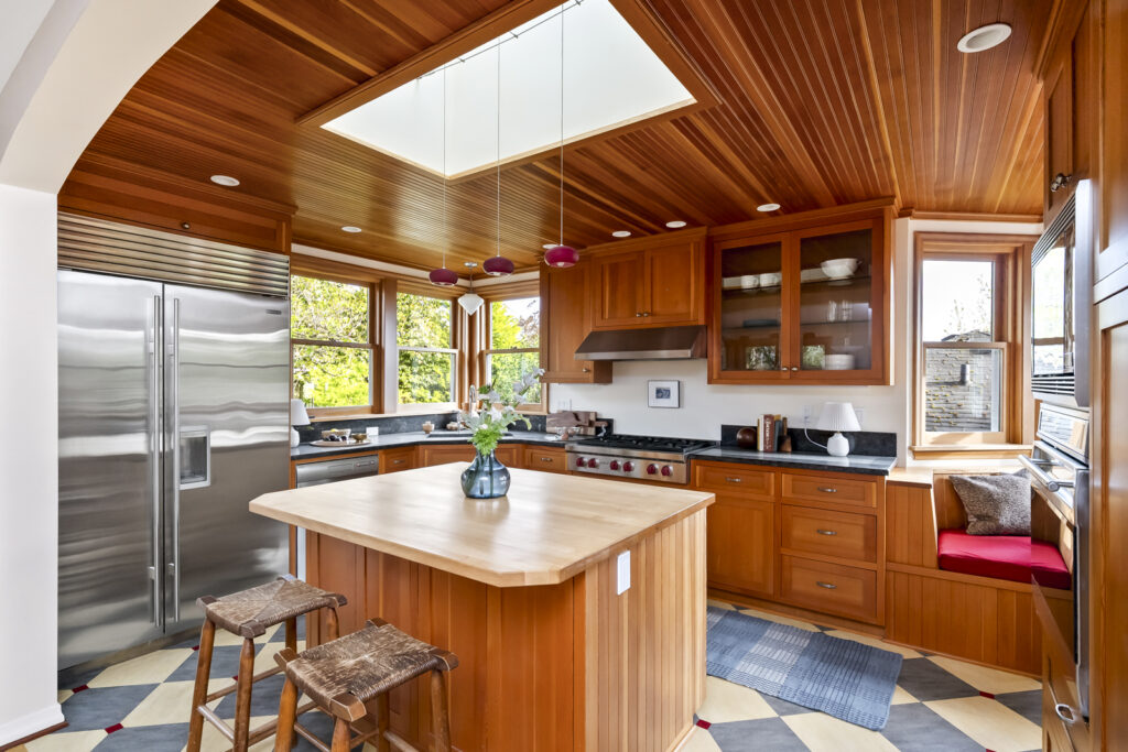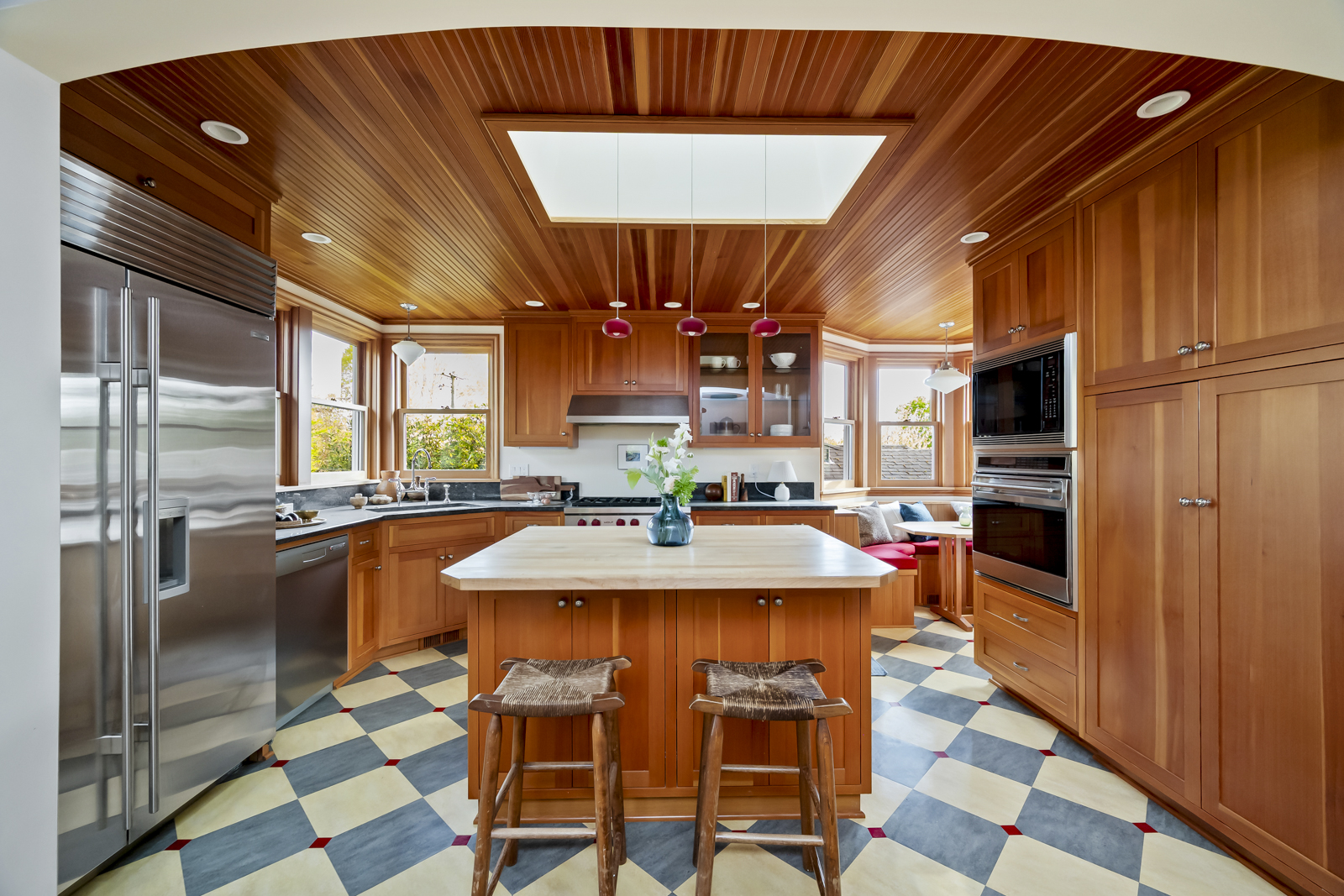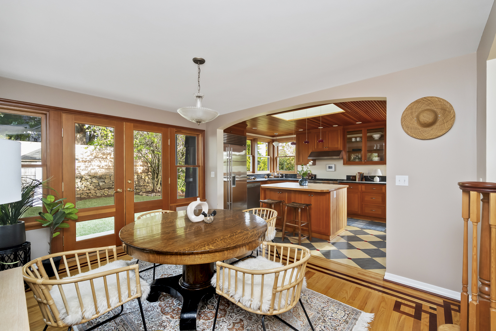 The open kitchen and dining area includes a custom yacht-style nook and flows seamlessly to a covered deck, patio, and lush, private yard—ideal for indoor-outdoor living. The kitchen is appointed with Marmoleum flooring and premium appliances, including a Wolf cooktop and built-in Sub-Zero refrigerator.