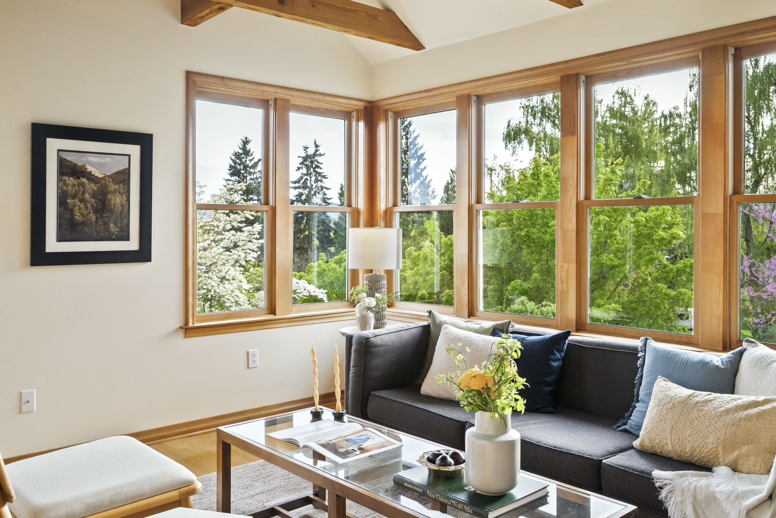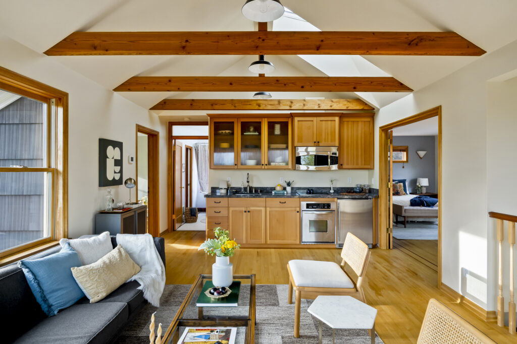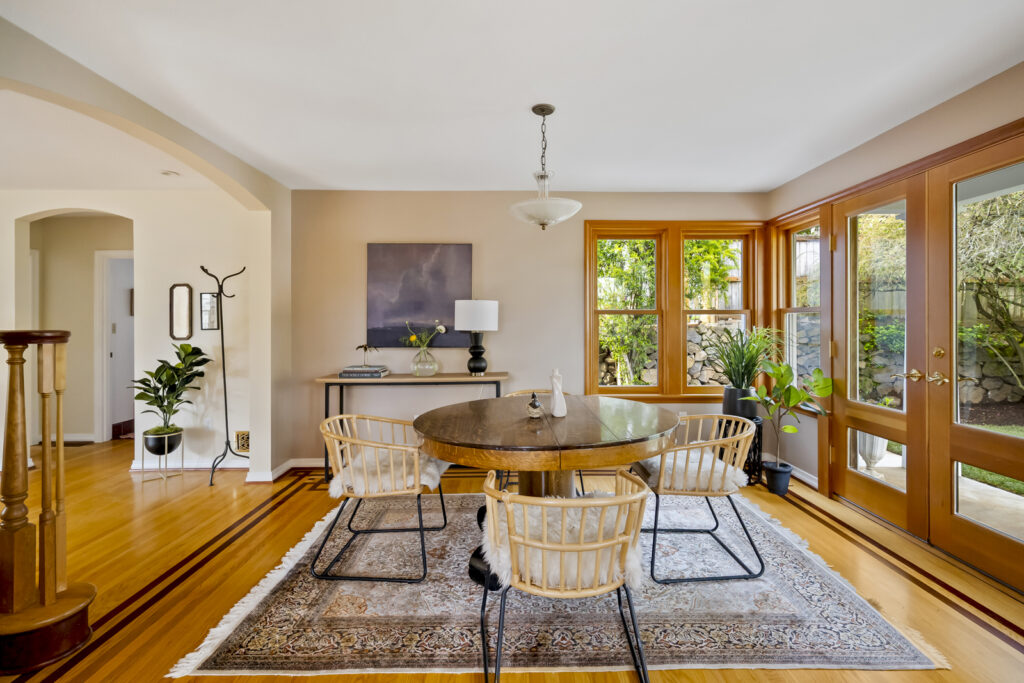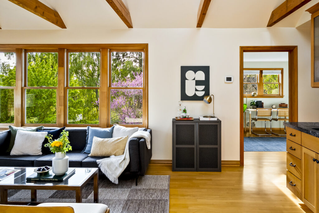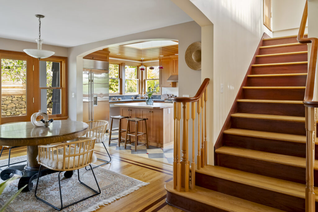 The open kitchen and dining area includes a custom yacht-style nook and flows seamlessly to a covered deck, patio, and lush, private yard—ideal for indoor-outdoor living. The kitchen is appointed with Marmoleum flooring and premium appliances, including a Wolf cooktop and built-in Sub-Zero refrigerator.