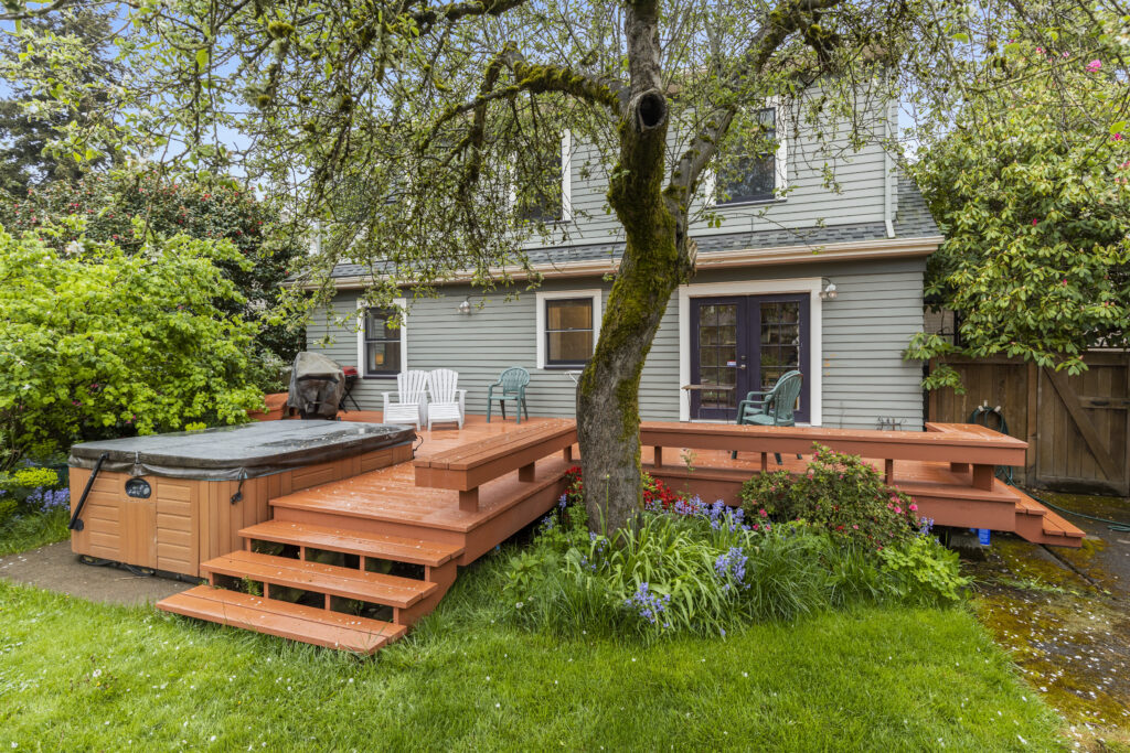Lovely and updated Mt Tabor home! Perched perfectly high off the street and on large lot, this solid house is in one of Portland’s nicest neighborhoods. Fully remodeled master upstairs with bonus room, walk-in closet, high quality finishes offers a private retreat. Find great updates such as A/C, seismic strapping, and all new double-pane windows. The gorgeous, fully fenced yard delivers privacy, a huge deck, and well-maintained hot tub. Beautiful and quiet tree-lined street, yet close to Division and Hawthorne hot spots!