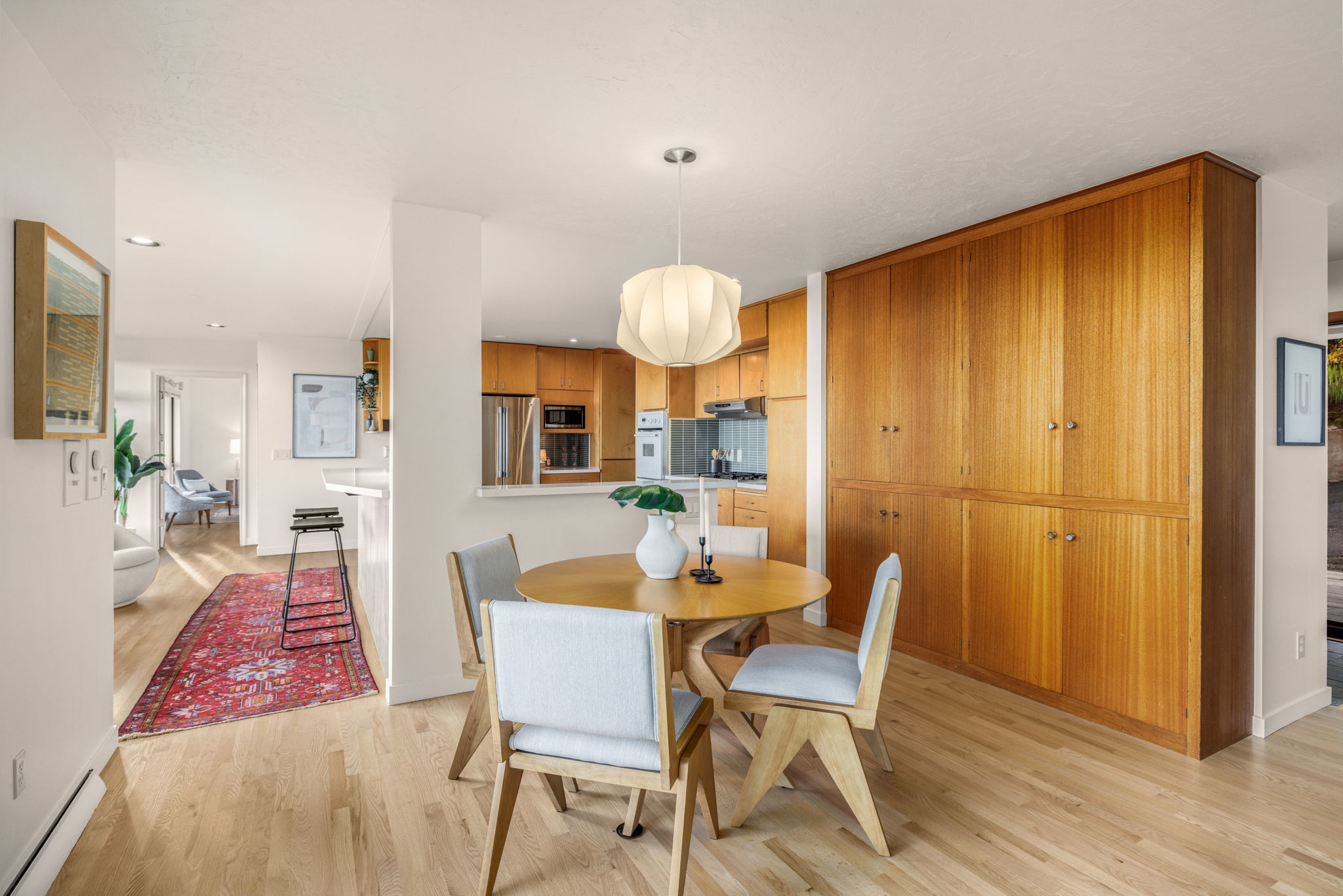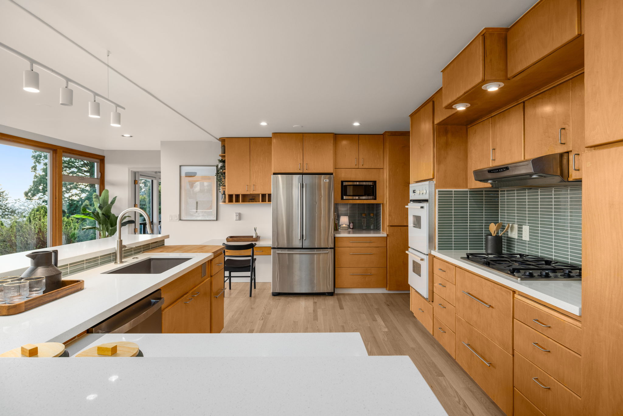 The refreshed kitchen is open + airy with bright quartz countertops with earthy tile backsplash. Enjoy a long kitchen bar to gather, JennAir gas range, coffee station, built-in desk, custom maple cabinetry, so much storage, and beautiful river views from the sink! The fabulous deck off the kitchen offers respite with windbreaker glass + stairs to the backyard.