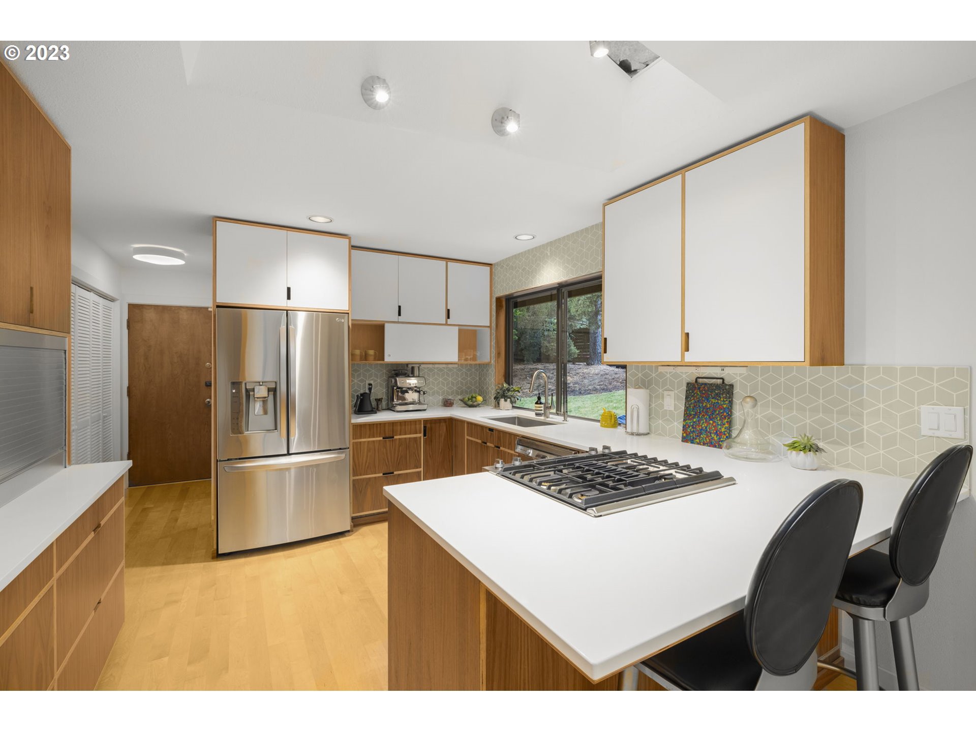 Stylish Mid Century single-level home perfectly perched one block from top-rated Bridlemile Elementary and the sprawling Hamilton park. This attractive home blends style with comfort and is loaded with updates including a completely remodeled interior with a gorgeous new kitchen with designer tile, stunning custom cabinetry and high-end appliances, a dreamy primary en suite bath, a new furnace and A/C, new metal roof and garage doors, and a new deck and irrigation system. Rare opportunity to live in this fantastic pocket of homes where great schools, parks, and sunset architectural strolls are right outside your front door.