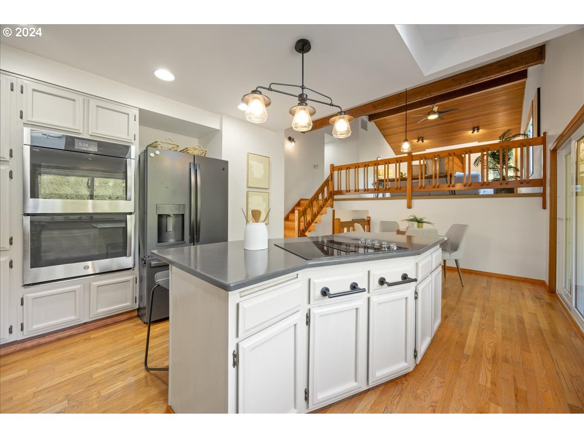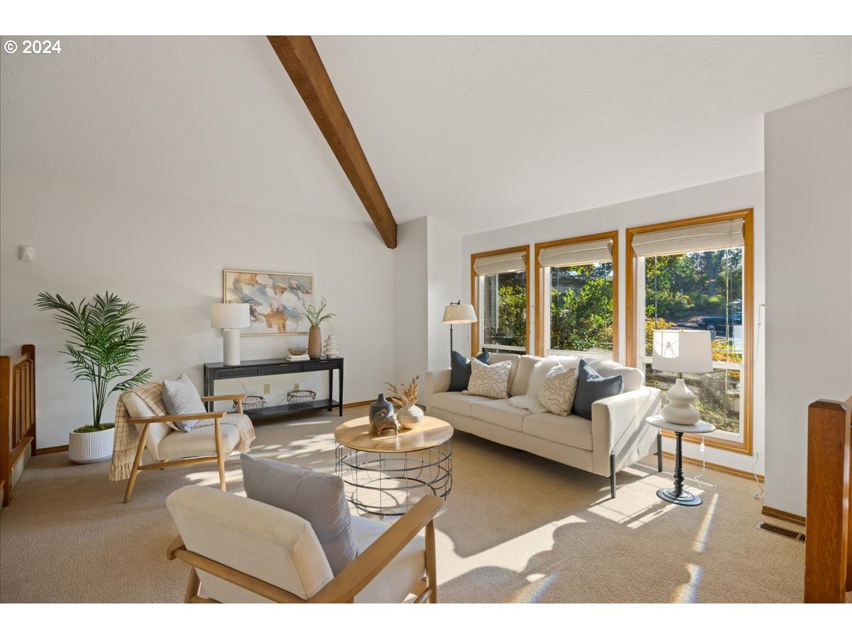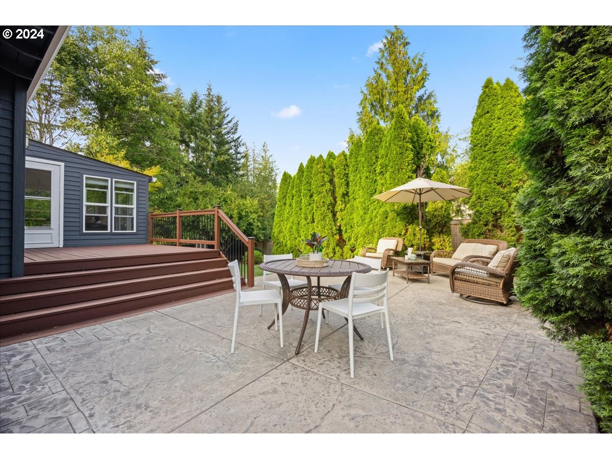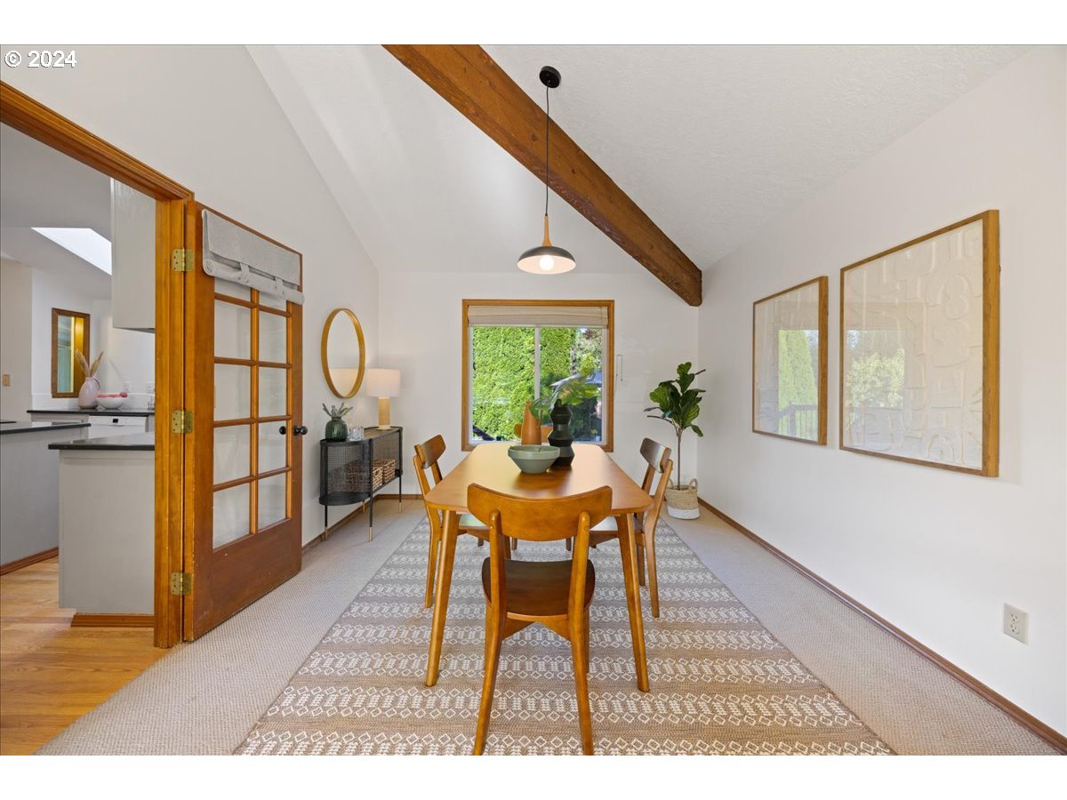 Mid century style in a modern package. This home has beautiful lines throughout and great outdoor spaces from the sunroom to the deck and large back patio and private yard. So many eye-catching interior features from the exposed beams to the wood accent walls and ceilings. Walk down the path to enjoy the amenities of the coveted Oak Hills community. Updated appliances include dishwasher, double oven with left opening doors and top oven with air fryer, and Matte Black fridge. Plenty of storage in the large garage as well as the outside shed and bonus storage under the sunroom. Sitting on a quiet cul de sac, this home is fantastically located just minutes from Bethany Village shopping and a quick drive to Nike, Intel, and great schools and parks and has no HOA dues.