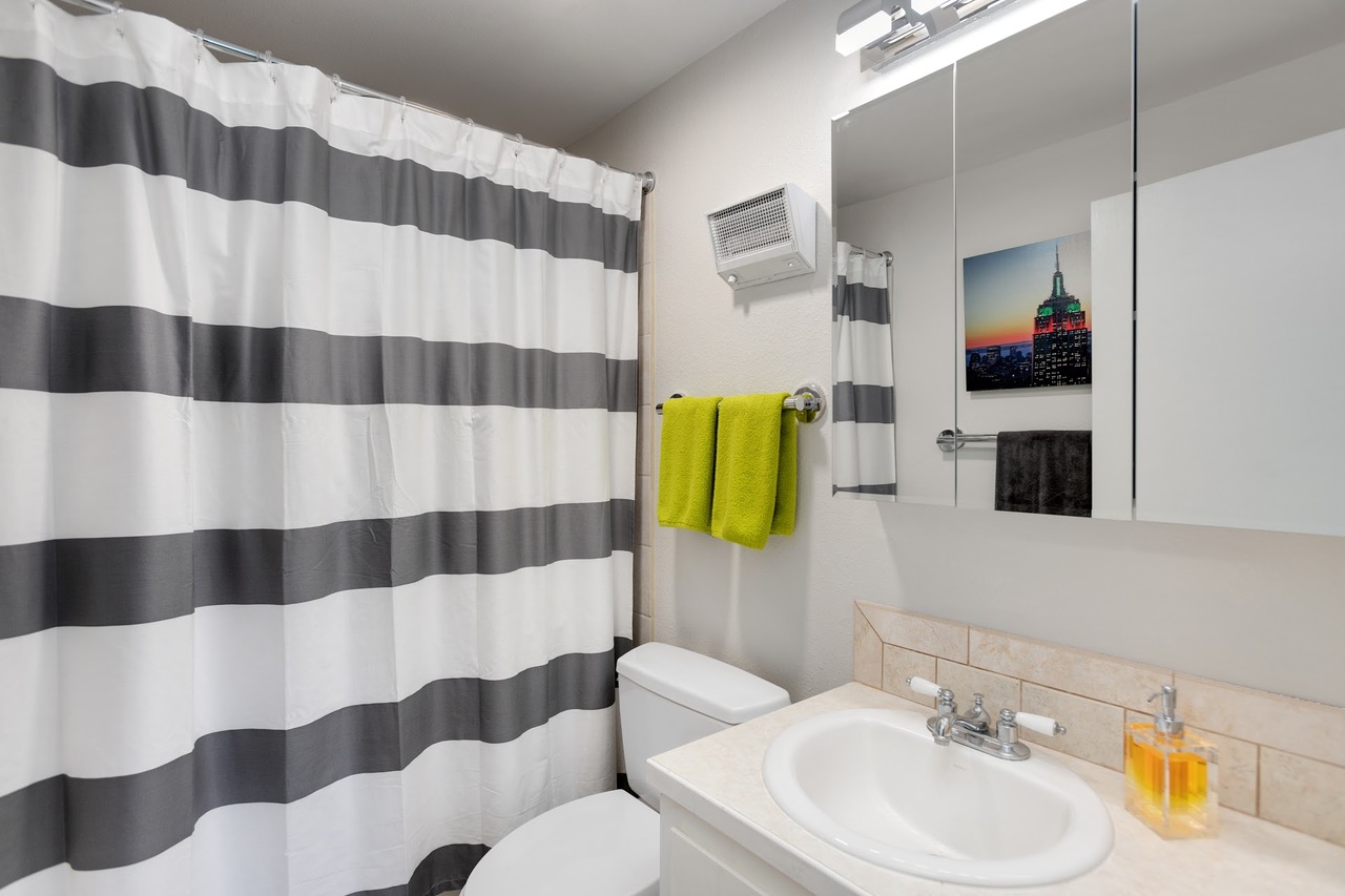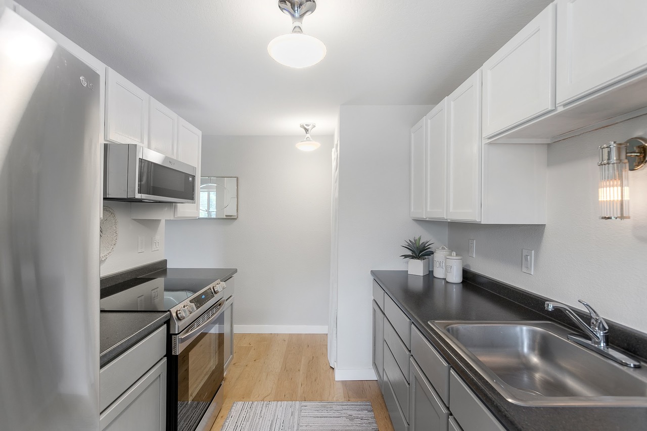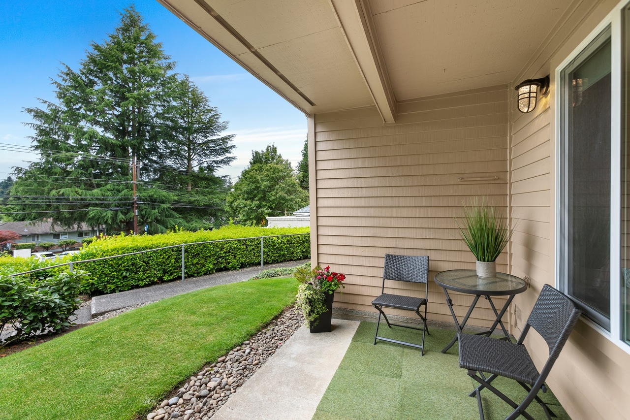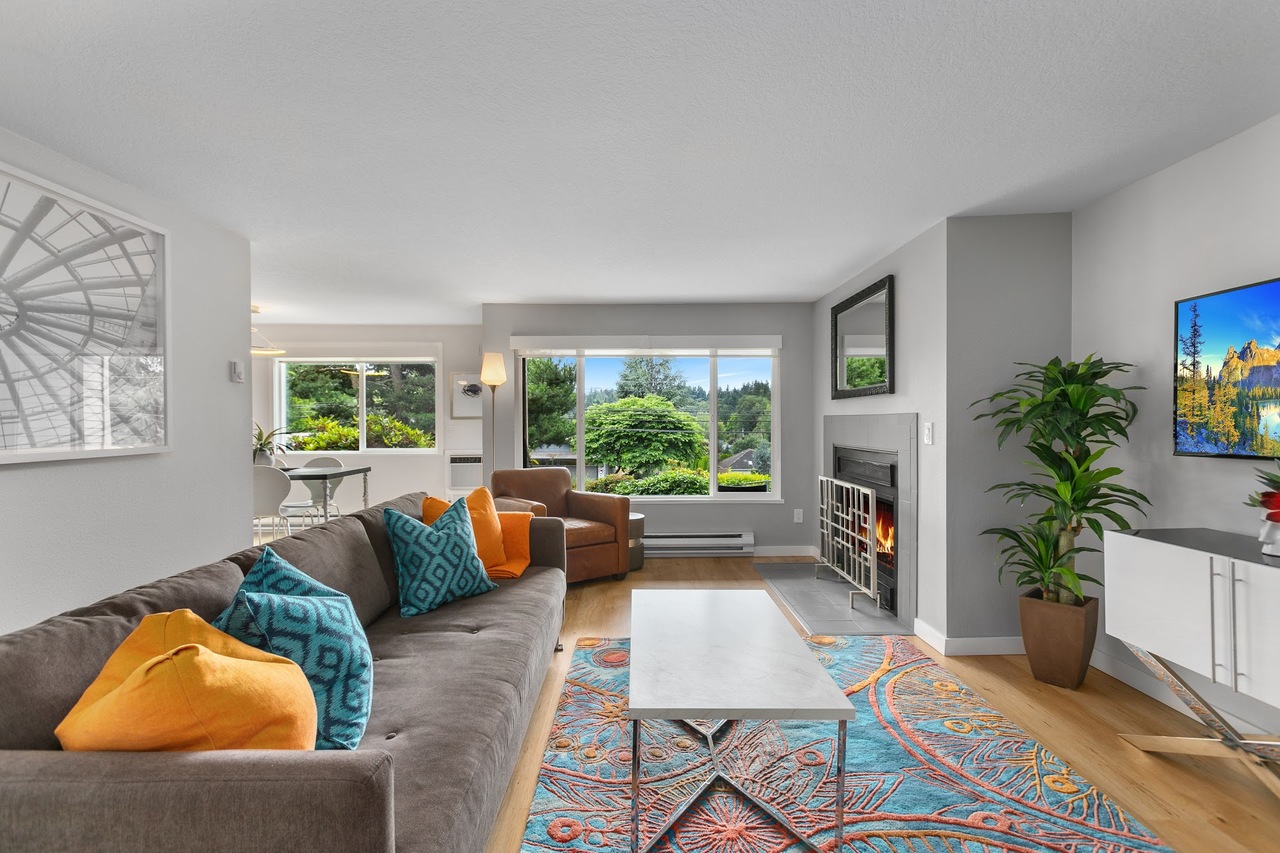 Spacious ground floor unit with distinct upgrades: flooring, stainless steel appliances, electric water heater, custom vinyl windows, and shades.
