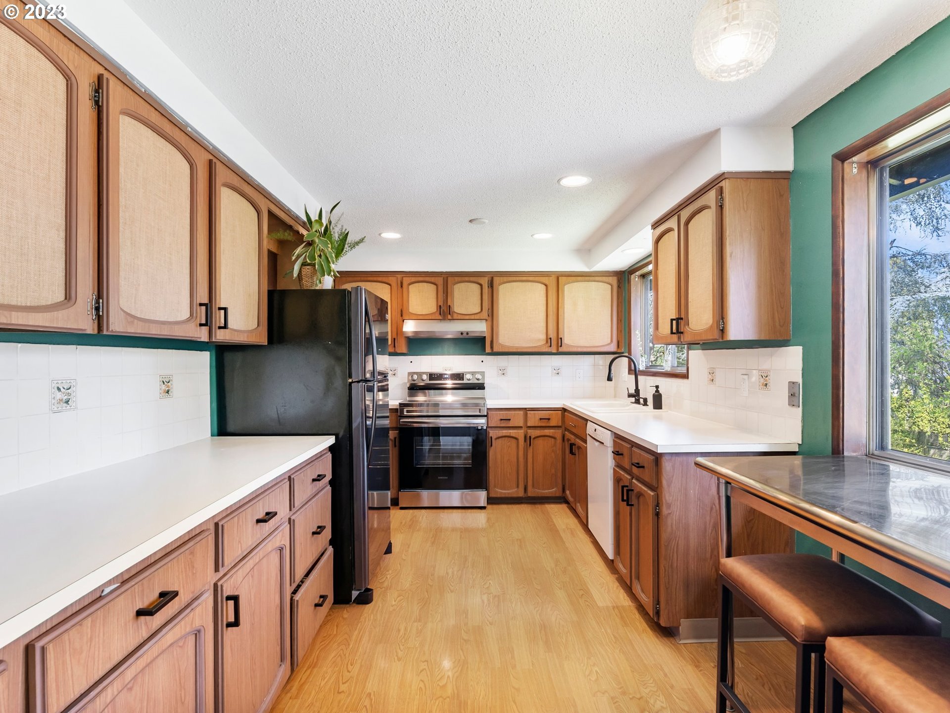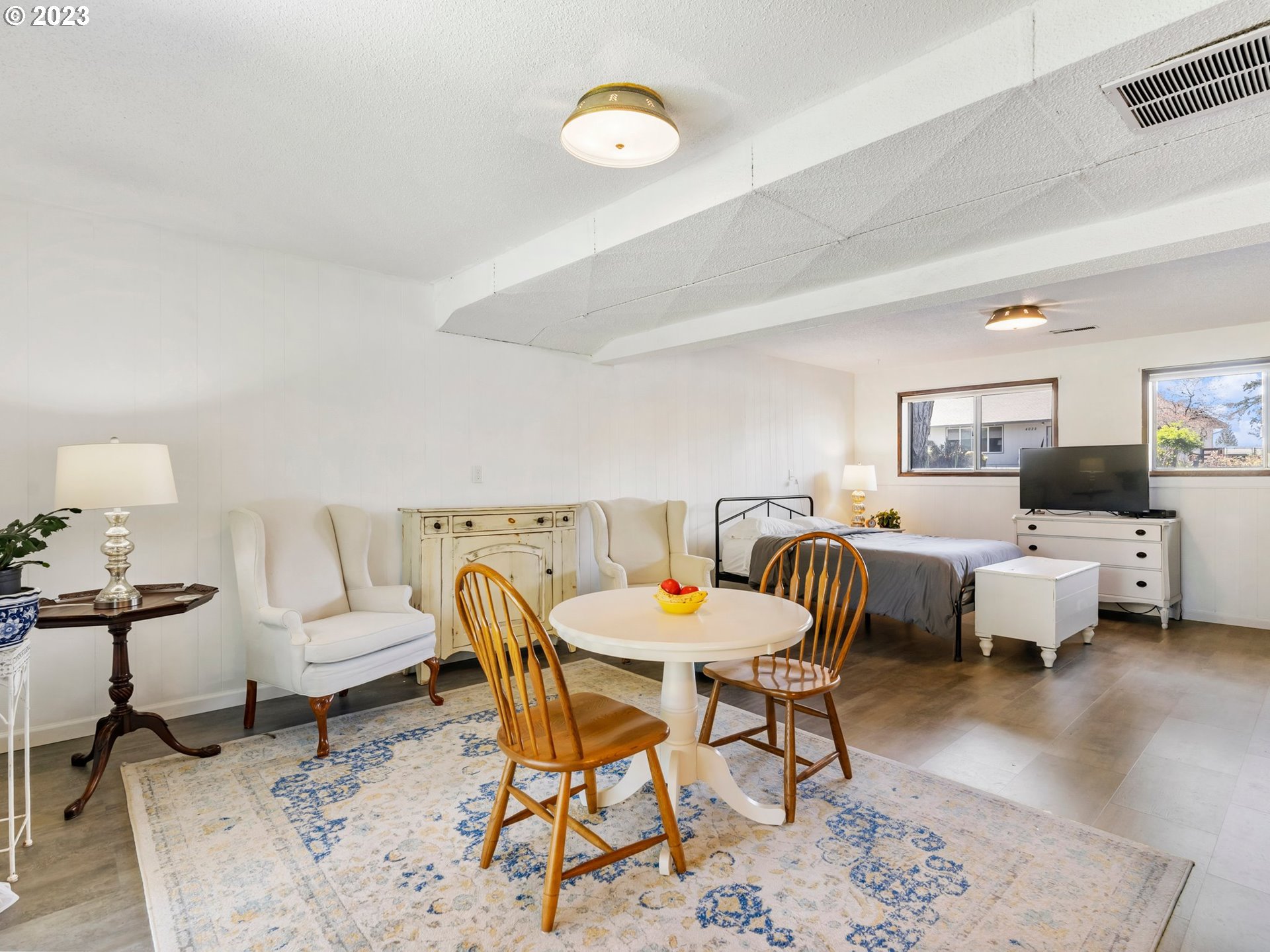Stunning and spacious split-level home located in the highly desirable Oak Grove neighborhood of Milwaukie. Boasting 2132 SF, this 4-bedroom, 3-bathroom home is sure to impress. The fully furnished kitchen is well-equipped, has ample counter space, and a convenient breakfast nook. A deck off the dining room extends the living space and entertainment possibilities. The exterior of the home has recently been painted, giving it a fresh and updated look. Inside, you’ll find many recent updates, including a newer heat pump with A/C, 2 gas fireplaces, newer hardwood flooring in upper level, a newer sliding glass door on the lower level, and new LVT flooring. All three bathrooms have been updated. The lower level boasts a full studio apartment with furnished kitchenette, making it perfect for use as an Airbnb, nanny or in-law quarters, or rental. It also features a slider leading to the fully fenced backyard, which is perfect for pets or outdoor entertaining. The 2-car oversized garage provides ample space for your cars, tools, and storage. One of the unique features of this home is its 100% natural and chemical-free yard, complete with an organic vegetable garden, old-growth heirloom roses, peonies, and pollinator plants that bloom throughout the year.