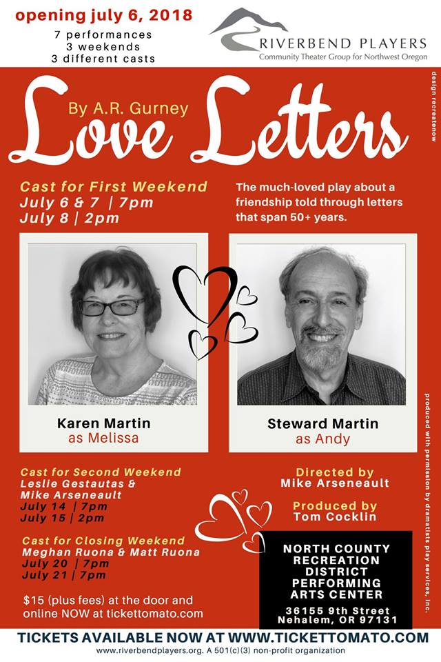 Don’t miss the opportunity to see this two character play Love Letters at our local performing arts center in Nehalem, Oregon. Coming to the North County Recreation District‘s Performing Arts Center beginning July 6, 7 and 8th.