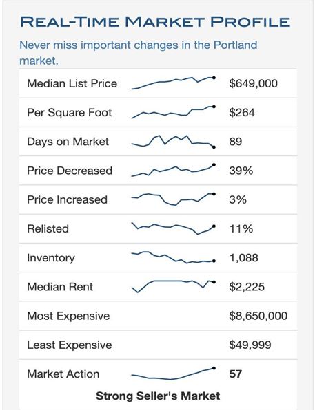 Home sales continue to outstrip supply with the Market Index moving up one point from last week. This week the median list price for Portland, OR is $649,000 with the market action index hovering around 57. This is an increase over last month’s market action index of 53. Inventory has held steady at or around 1,088