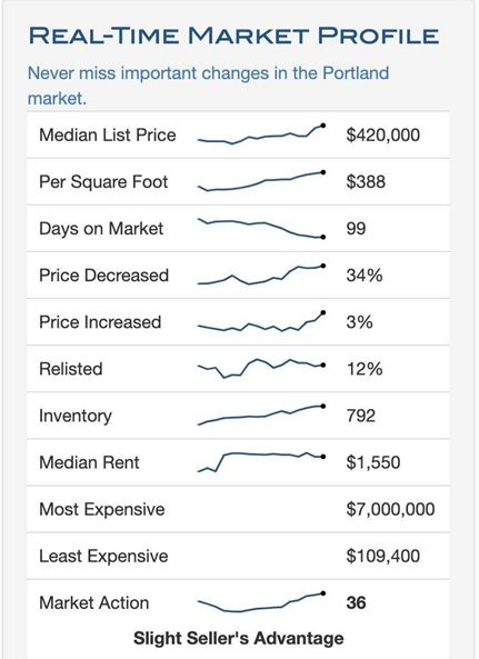 This week the median list price for Portland, OR is $420,000 with the market action index hovering around 36. This is an increase over last month’s market action index of 34. Inventory has held steady at or around 792. Although lower