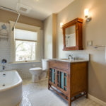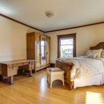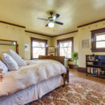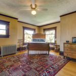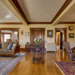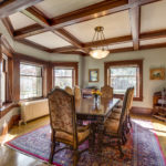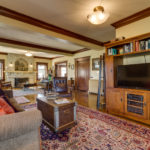 The third floor billiard room comes with its original raised detail fresco on all four sides of the ceiling, and the awning windows in the ballroom have Craftsman “nine-pane” muntins. Other highlighted architectural details include bellcast roofs on the house, dormers and porch, leaded glass in the entry, and a rough cut stone chimney with crenellated chimney cap. The attached garage features a 1 bedroom / 1 bath ADU on the second level.