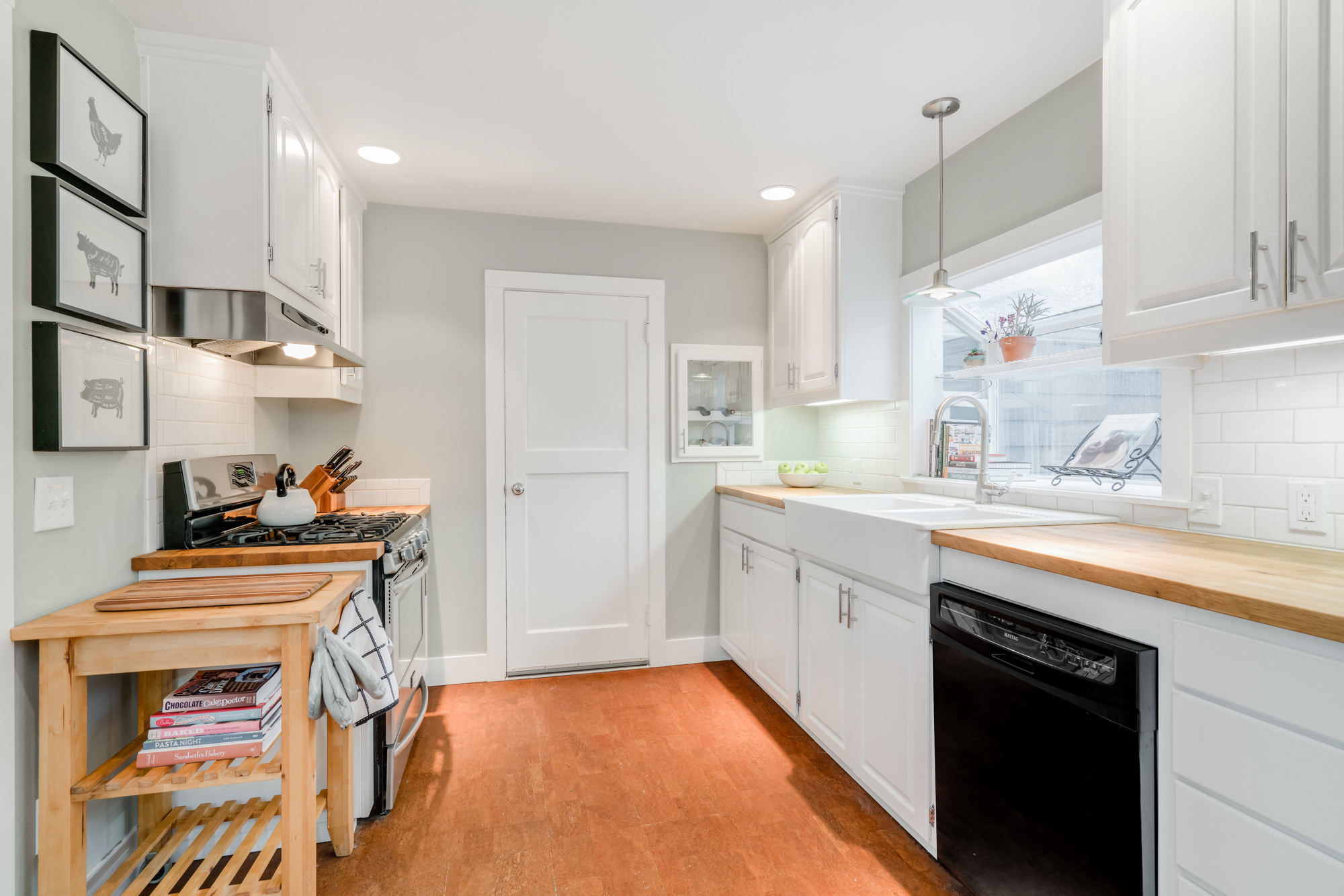 Originally built in 1943, this gorgeous ranchalow is perched perfectly on SW Flower Terrace in Hillsdale. A combination of period finishes, beautiful updates and careful stewardship offer the next homeowner a unique opportunity to own a turn-key, close-in home at a hard to find value. The main floor boasts an open, light-filled living and dining space with hardwood floors and a broad shouldered fireplace. Two quaint bedrooms lie adjacent to a remodeled bathroom with subway tile, built-ins and designer fixtures. An open, expansive kitchen features a gas range, farmhouse sink, butcher block counters, cork floors, large pantry and a great flow from the attached garage or directly to the backyard patio.