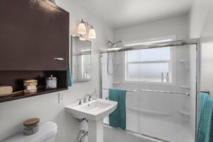 They had some dated flooring and heavy furniture that made the media/family room smaller, with rich red walls. I suggested a light gray durable carpet and shared the staging vision I had for that room. The single bathroom felt small, had chipped flooring and also felt a little dated. I suggested a swap out of the vanity, new tile floor, fresh paint and a pop of color. They also had a few hours of elbow grease to put in, polishing hardwoods, trimming and pruning, and getting the house show ready. And they had 3 weeks to do it.
